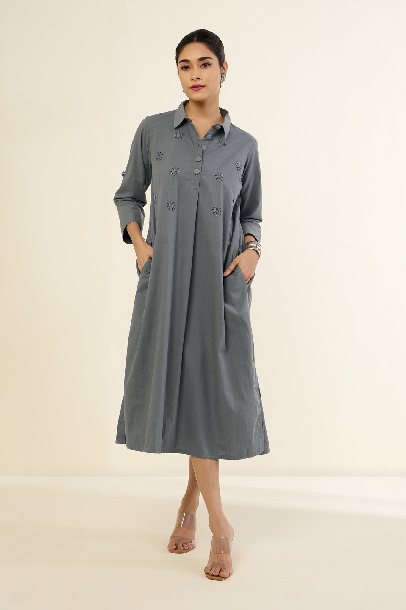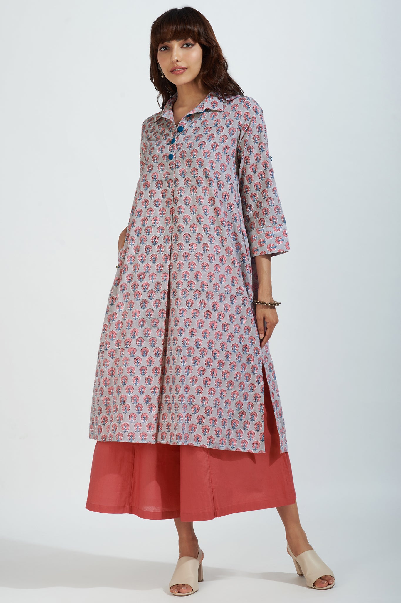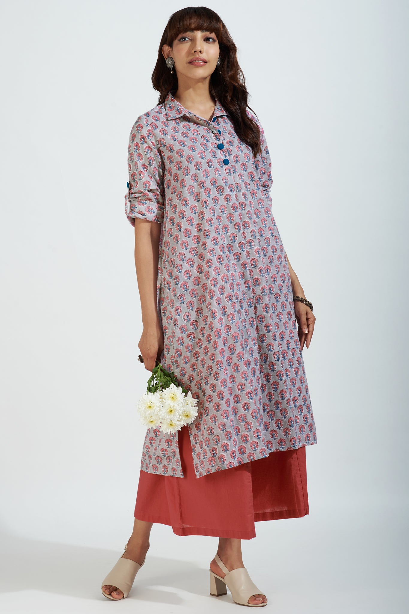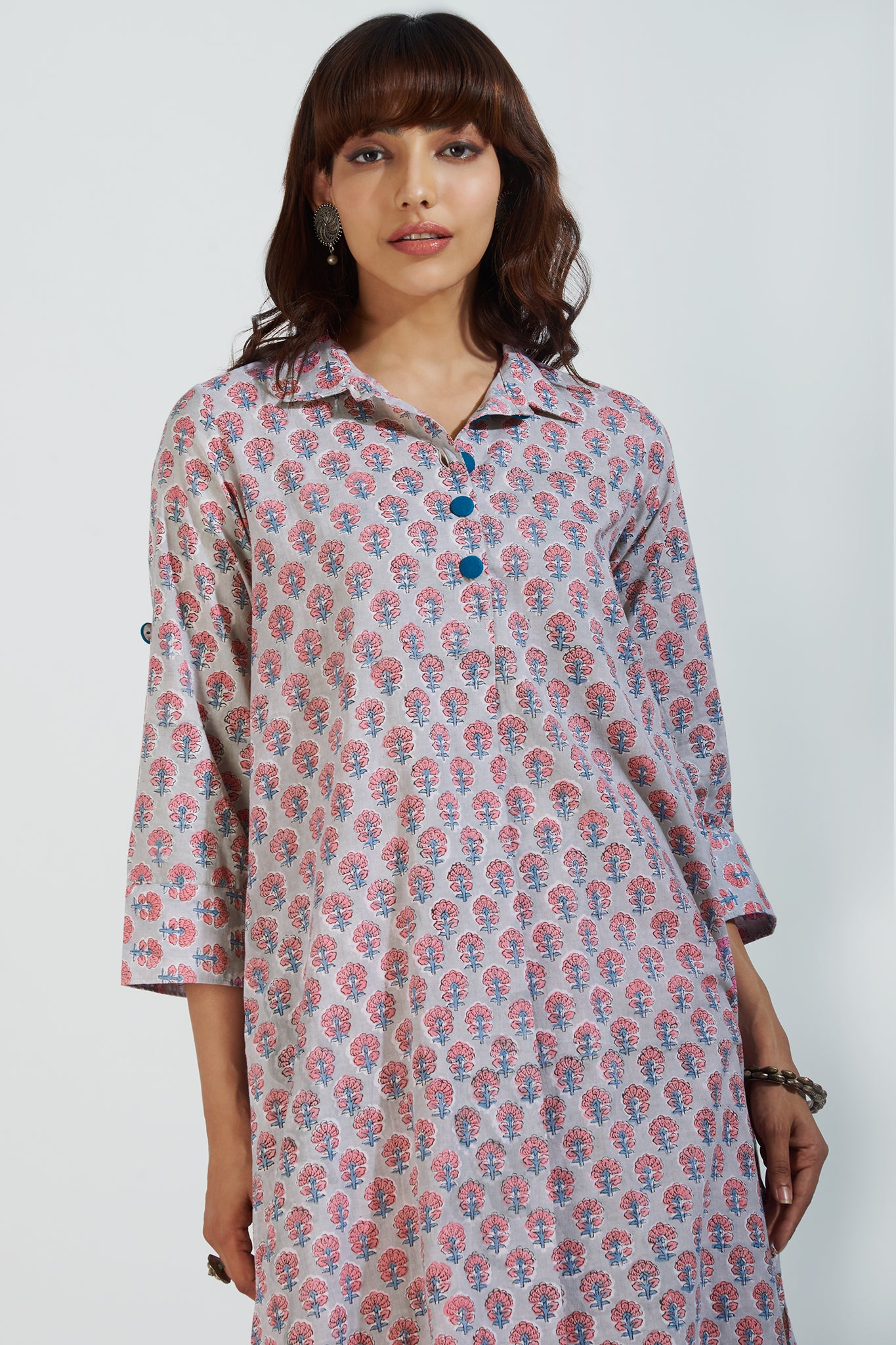 This exquisite shirt dress in mesmerizing hues of grey with pink small buttis all over has been carefully chosen for its unique shade and intricate details, making it the perfect outfit for any occasion. We selected this particular shade of grey pink because it exudes elegance and sophistication, while the indigo buttis add a touch of charm and personality.