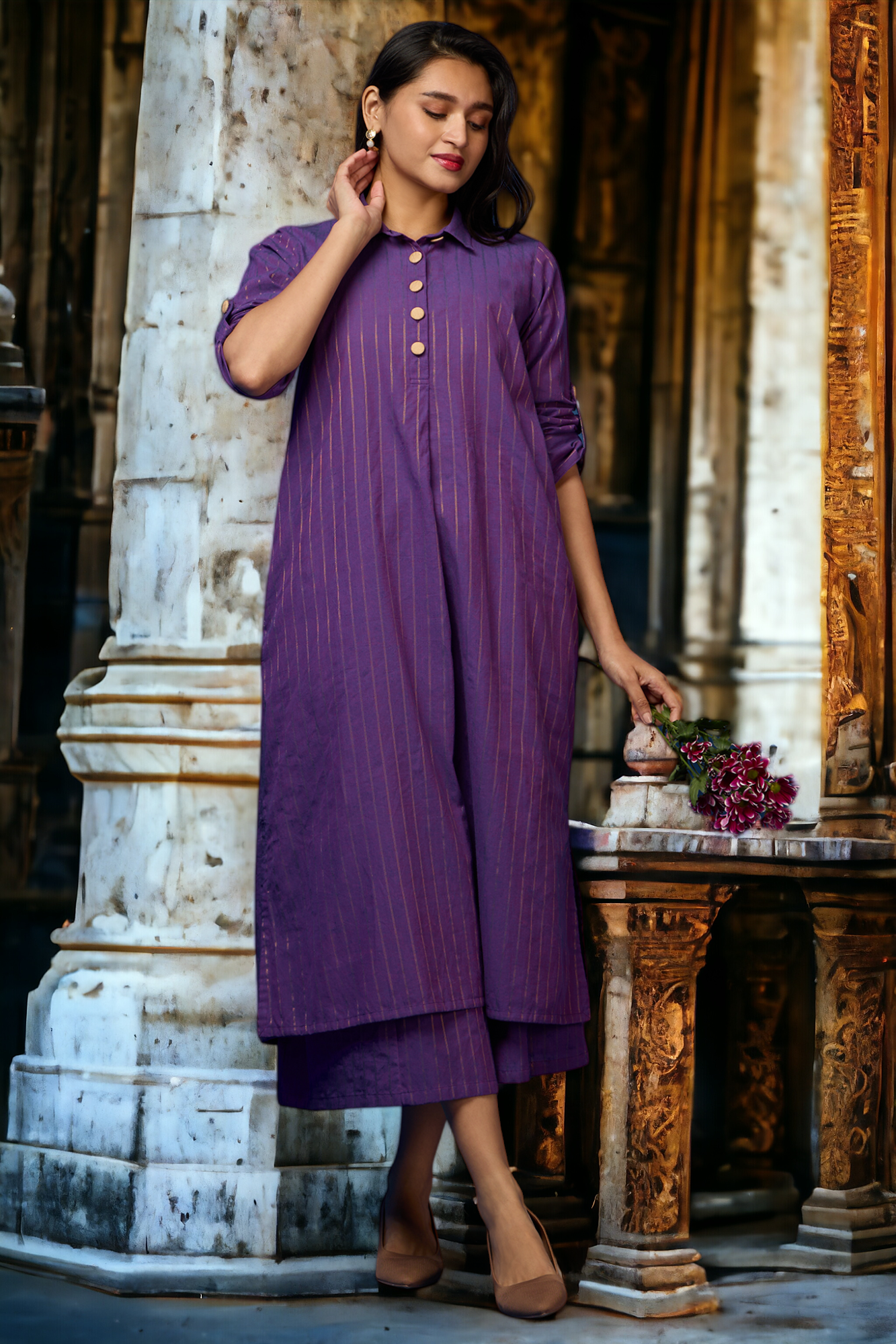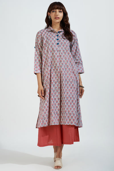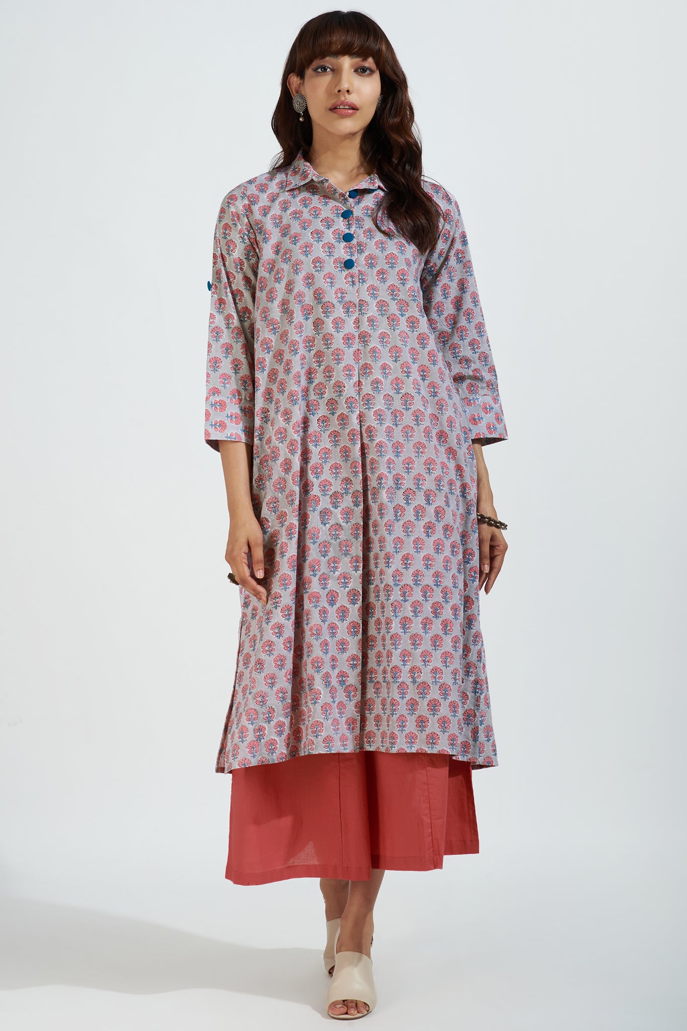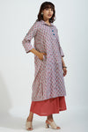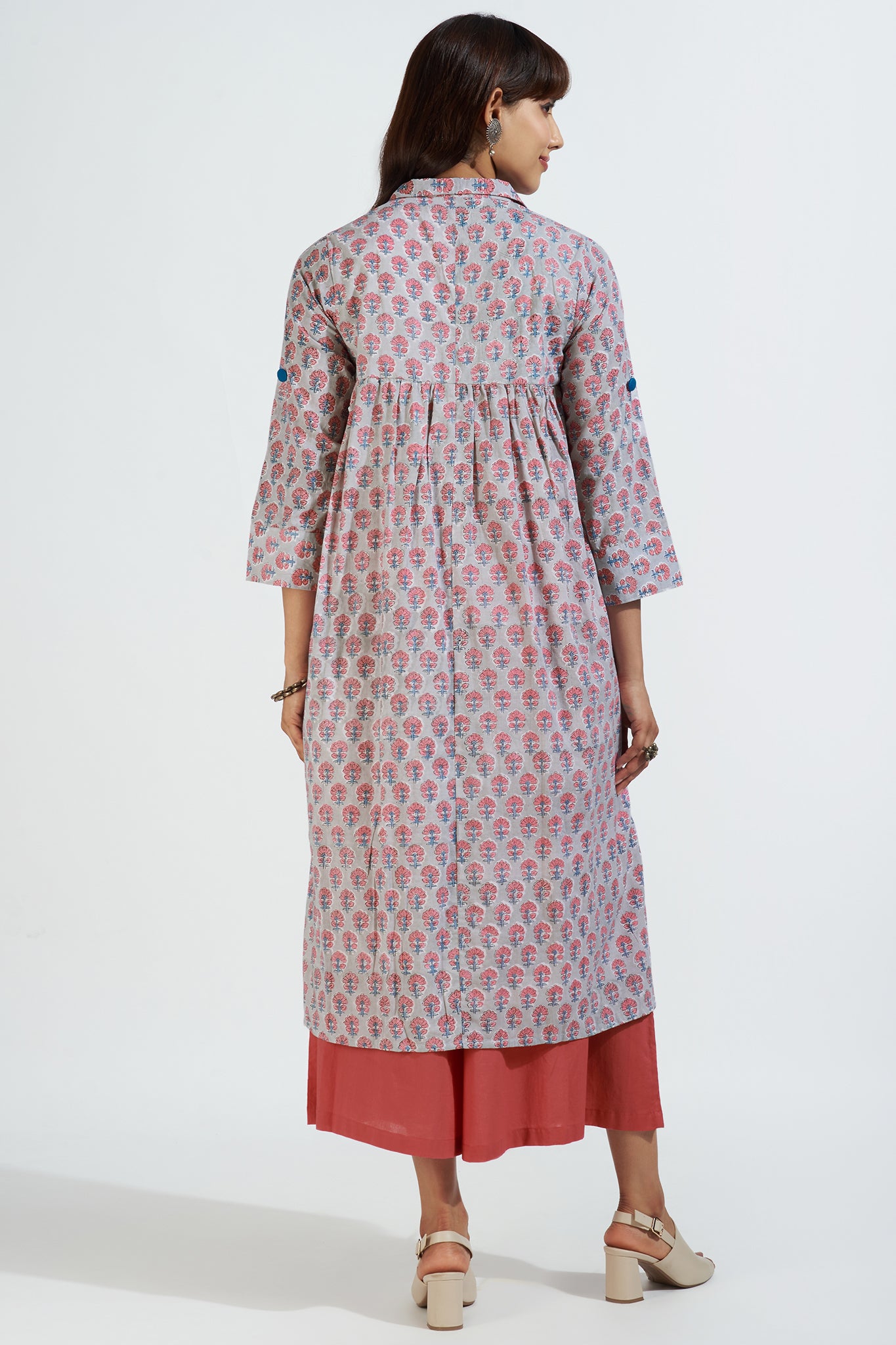 This exquisite shirt dress in mesmerizing hues of grey with pink small buttis all over has been carefully chosen for its unique shade and intricate details, making it the perfect outfit for any occasion. We selected this particular shade of grey pink because it exudes elegance and sophistication, while the indigo buttis add a touch of charm and personality.