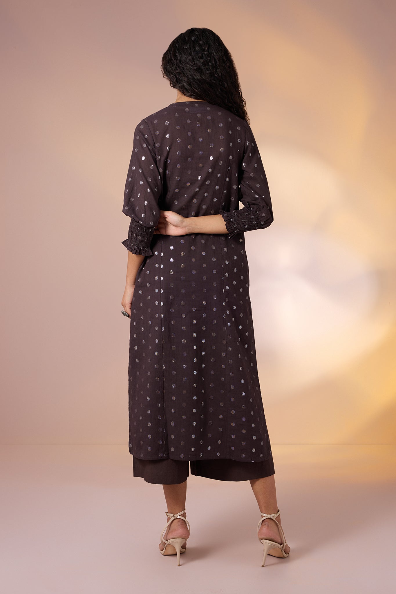Mocha Dusk & Silver Scatter Cotton Kurta with Smocked Cuff & Tassels
