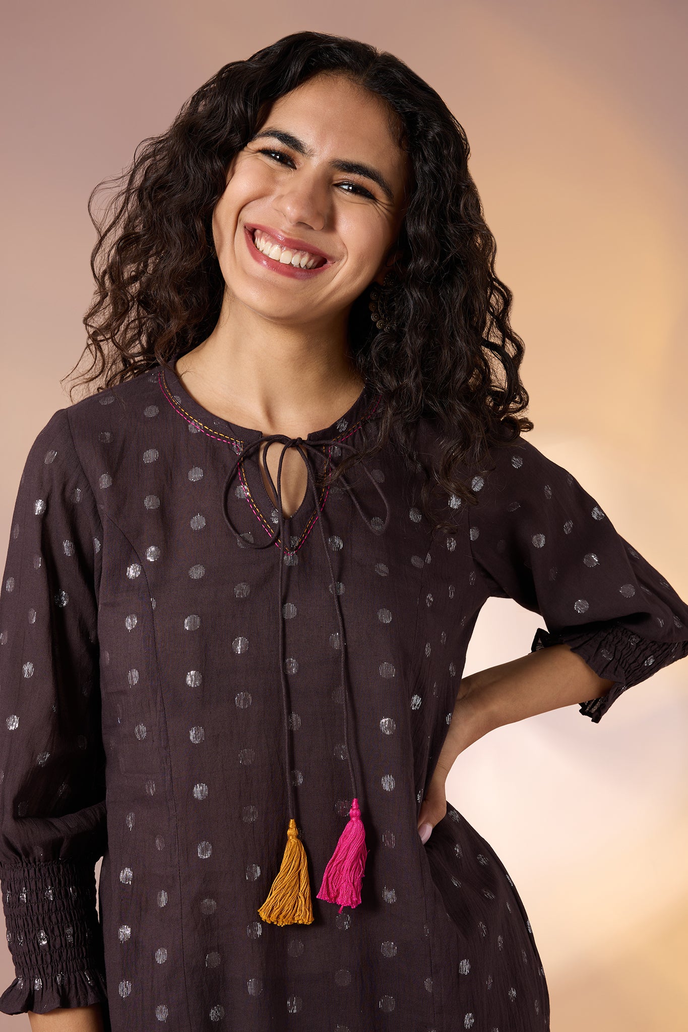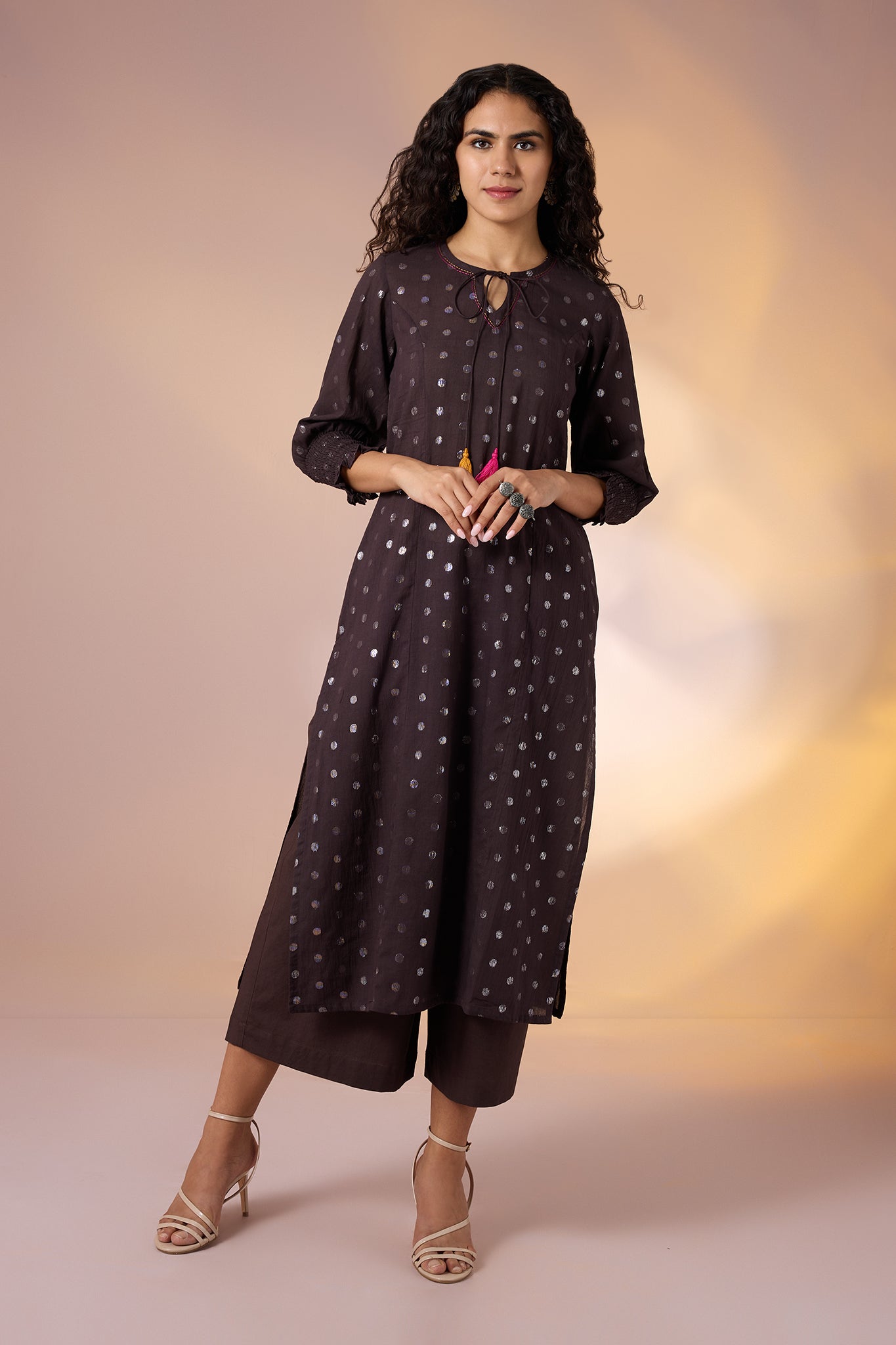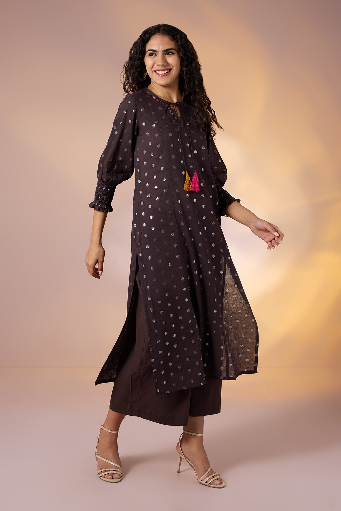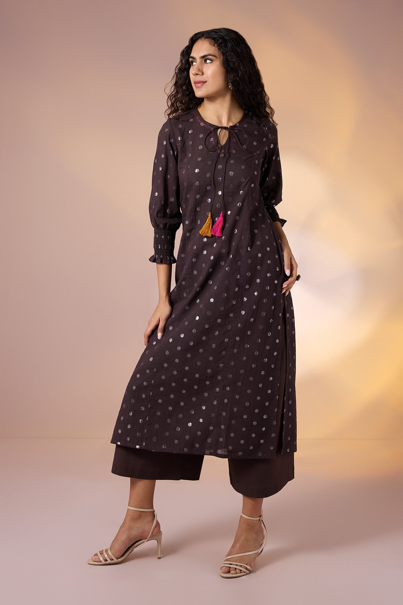Handcrafted in 100% cotton, this straight kurta in rich deep brown is delicately dotted with silver accents for a subtle festive shimmer. The round neckline is finished with playful tassels in vibrant pink and yellow, bringing a joyful splash of colour, while smocked sleeve cuffs add a tailored, textured charm. Designed with a front slit for ease and comfort, this kurta balances everyday wearability with festive detailing. Style it with matching straight pants for a coordinated earthy look, or pair it with a contrasting pop of colour ike fuchsia or mustard for a celebratory, statement-ready ensemble.