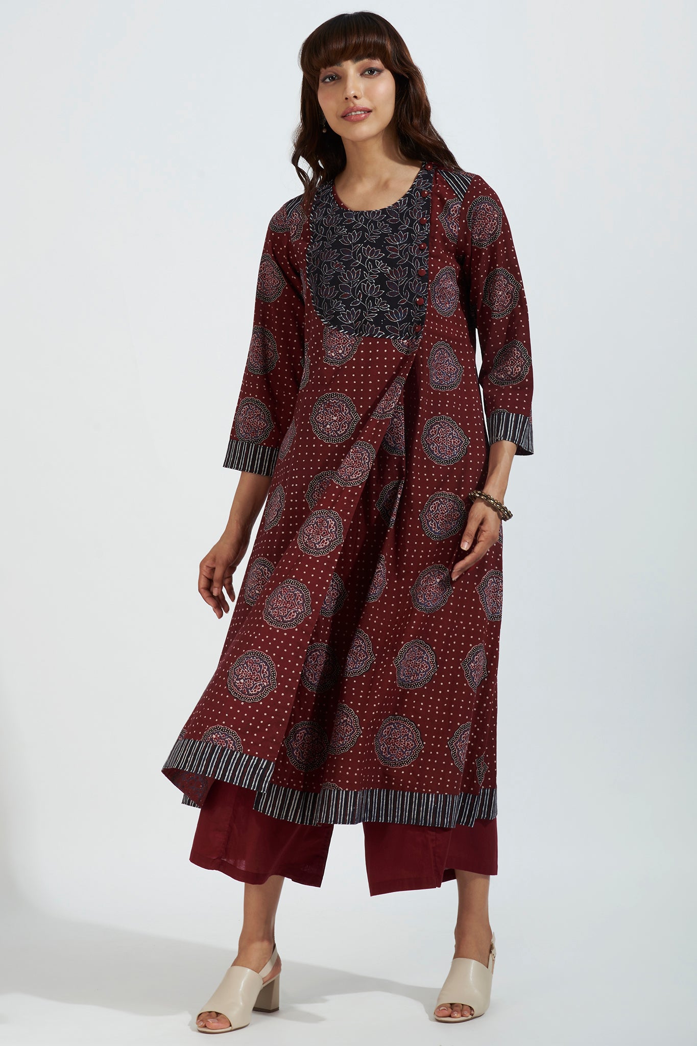 The 3/4th sleeves with cuff detail enhance the silhouette, creating a flattering fit that complements various body types. Paired perfectly with culottes in a harmonizing monotone maroon, the ensemble is an ode to coordination and refinement.