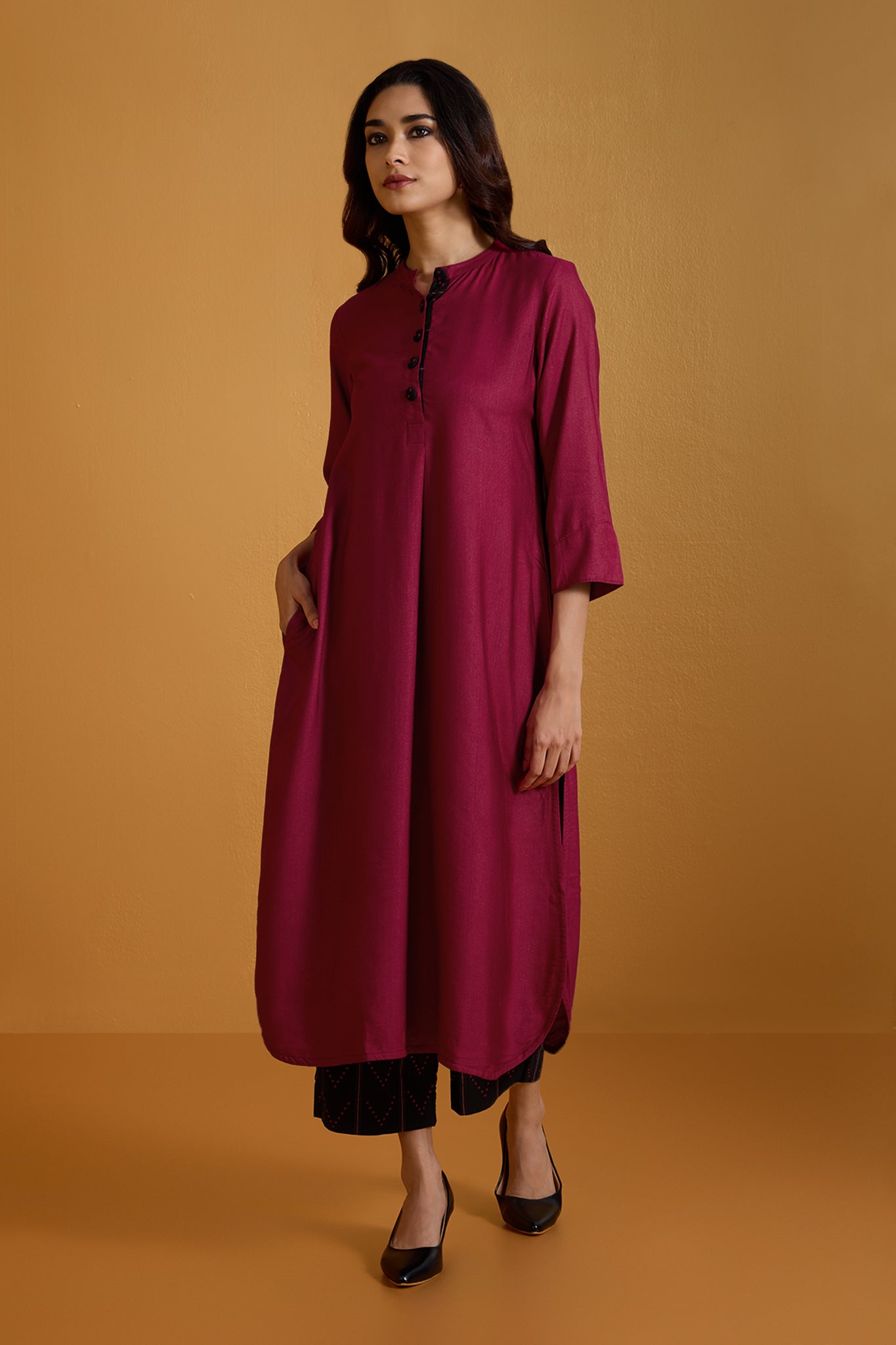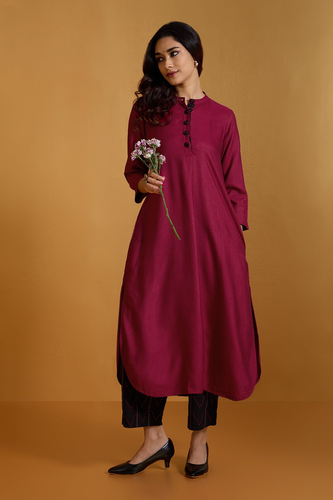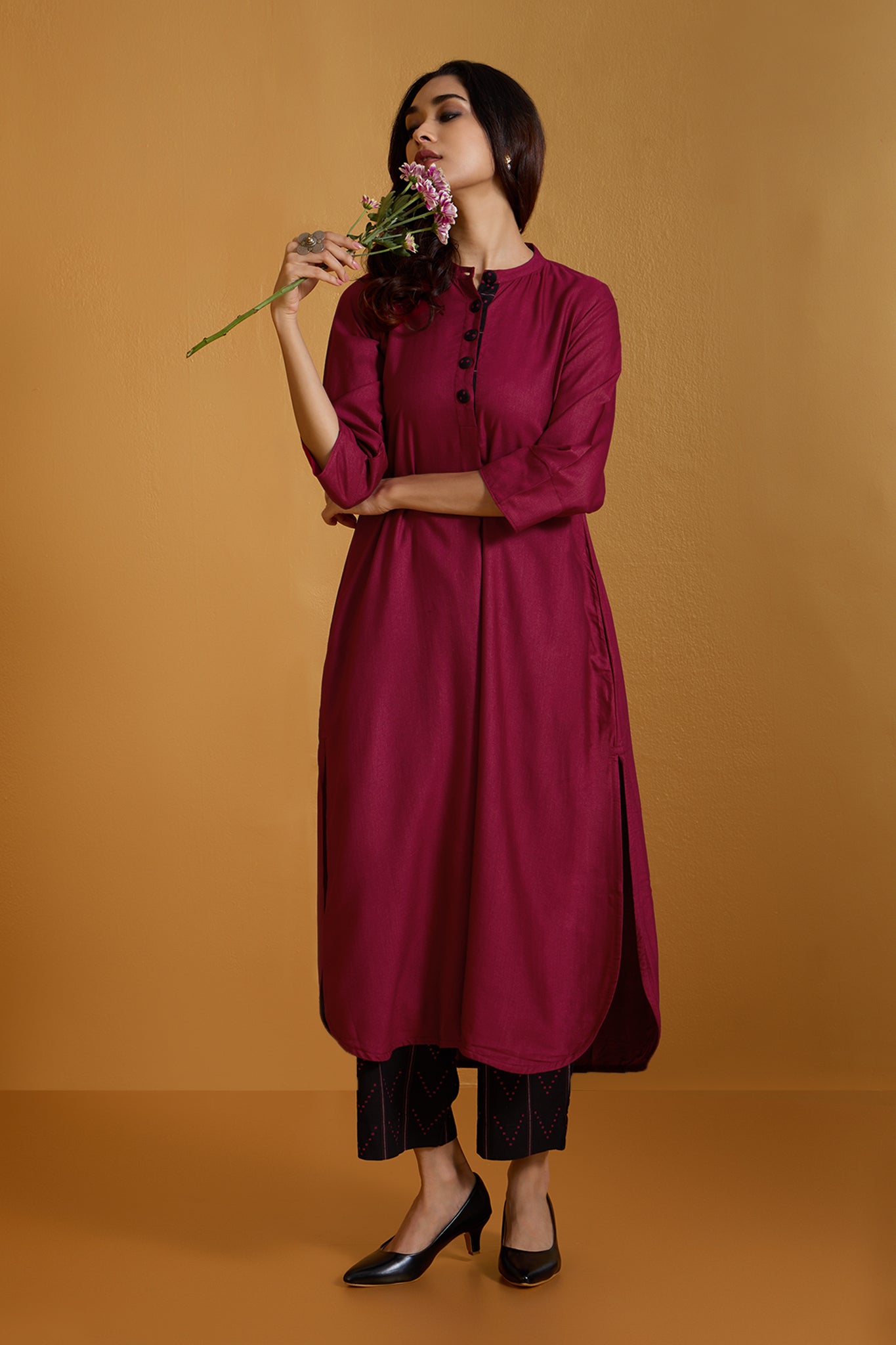 Fabric: Handcrafted in soft viscose silk, comfort & ease all year around. Bold & Striking: A long kurta set designed to make a statement in modern workwear, blending tradition with contemporary elegance. Standout Design: Features a stand collar neckline with a front placket, adorned with handmade black buttons in contrast to amp the silhouette. Craftsmanship: Handcrafted for comfort and style, with breathable fabric ensuring all-day ease. Professional & Stylish: Perfect for the office, this kurta redefines workwear with its intricate detailing and standout design.