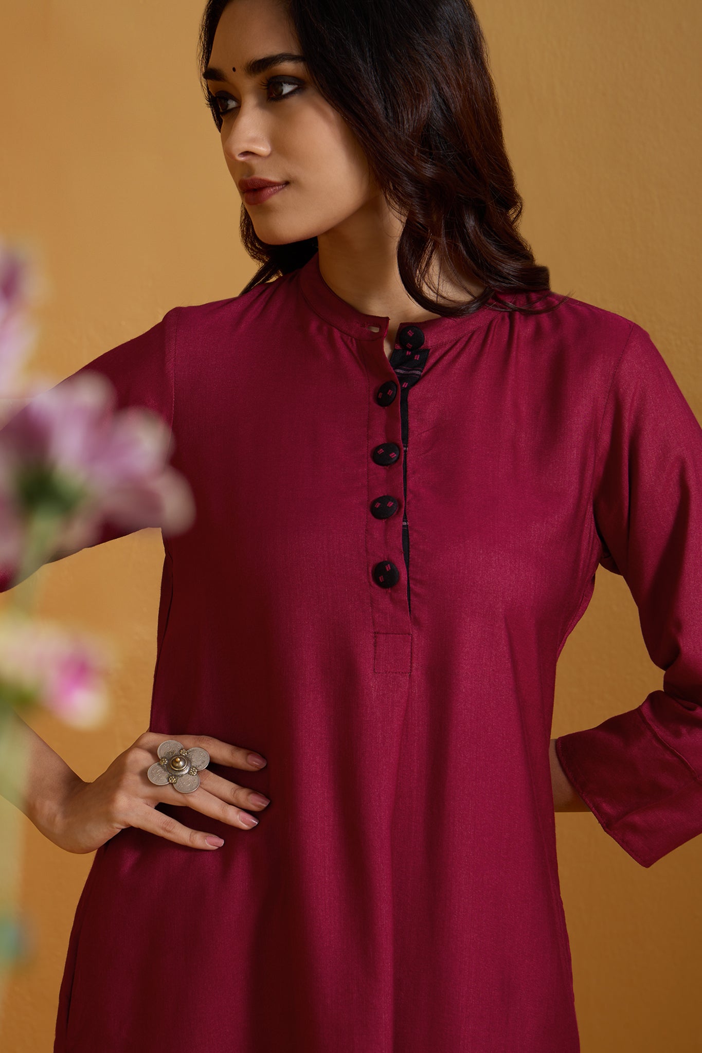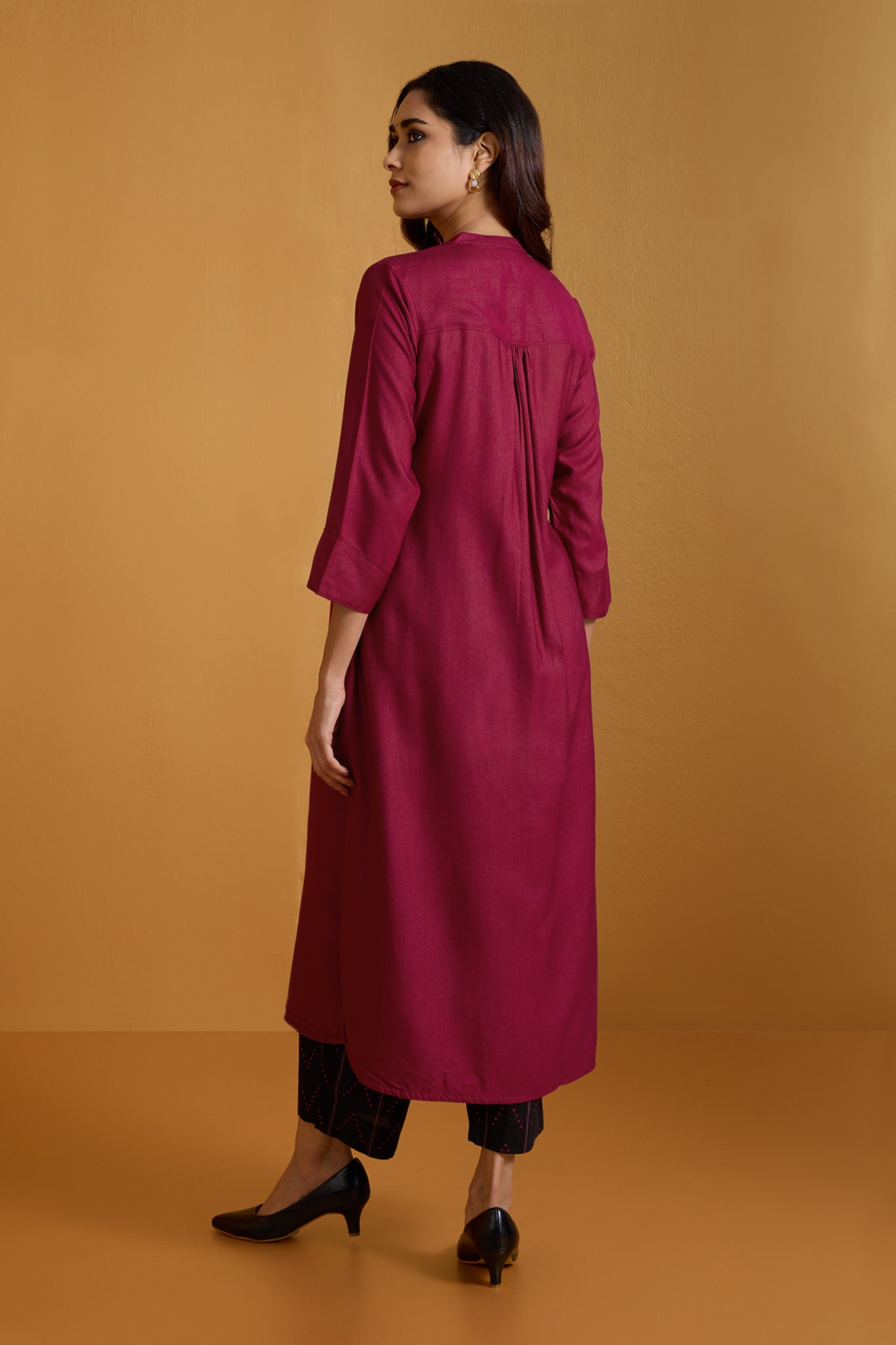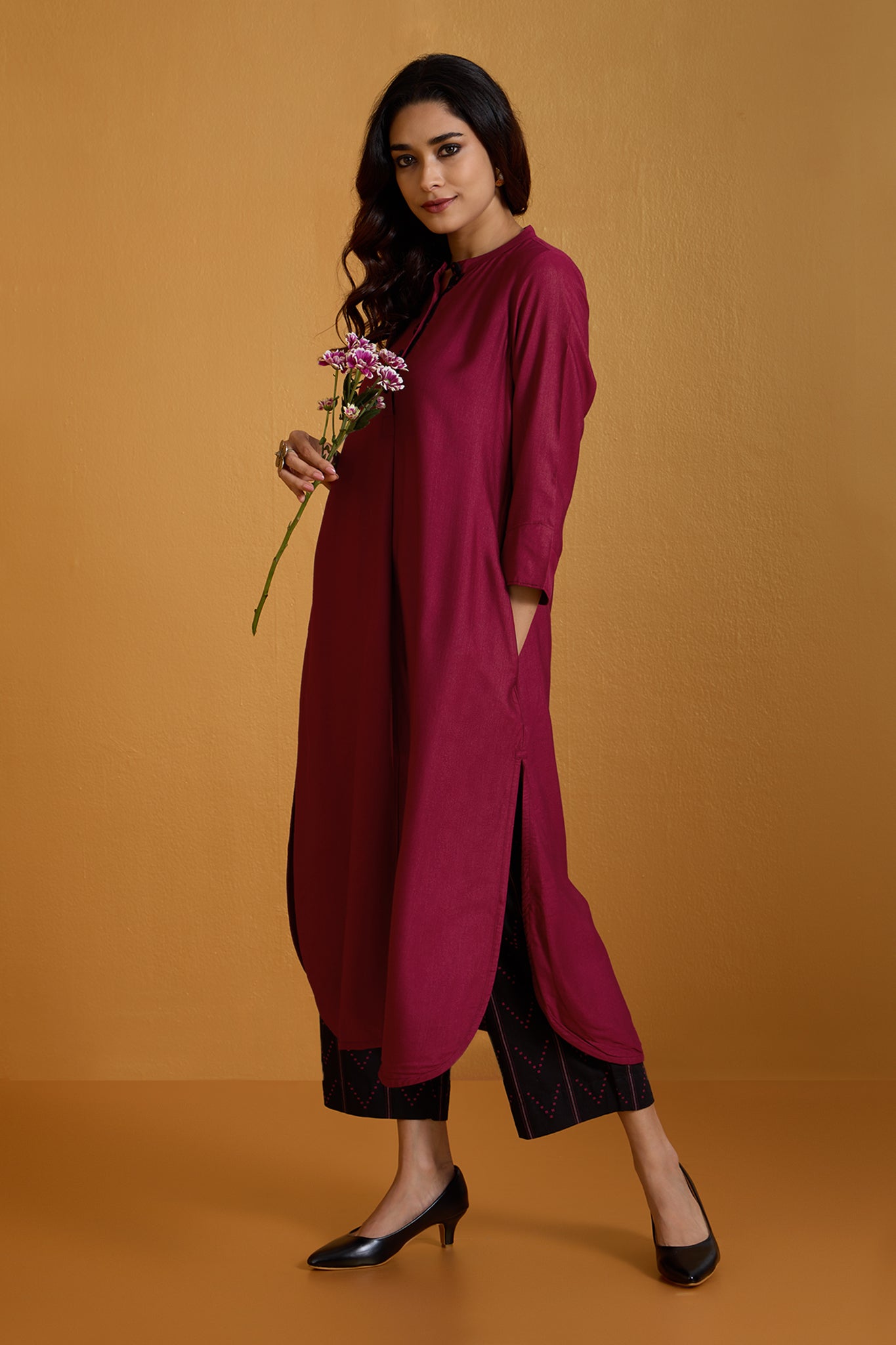 Fabric: Handcrafted in soft viscose silk, comfort & ease all year around. Bold & Striking: A long kurta set designed to make a statement in modern workwear, blending tradition with contemporary elegance. Standout Design: Features a stand collar neckline with a front placket, adorned with handmade black buttons in contrast to amp the silhouette. Craftsmanship: Handcrafted for comfort and style, with breathable fabric ensuring all-day ease. Professional & Stylish: Perfect for the office, this kurta redefines workwear with its intricate detailing and standout design.
