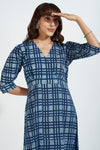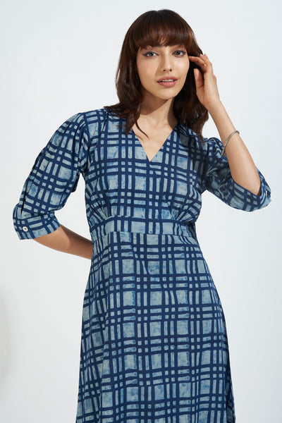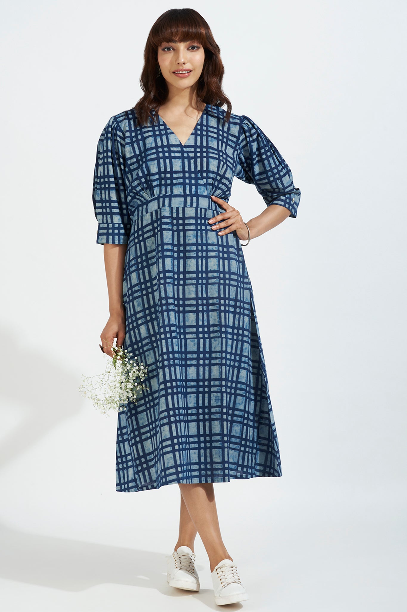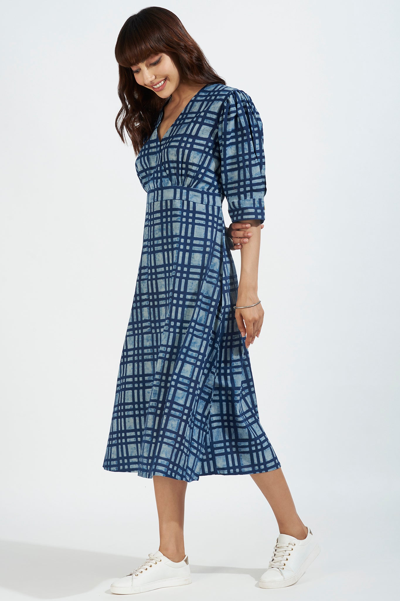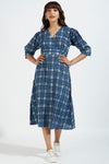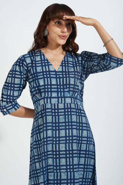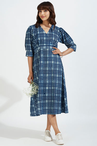Embodying a chic silhouette, this dress effortlessly flatters your figure and exudes a sense of confidence wherever you go. The indigo checks, handblock printed in the heart of Jaipur, Rajasthan, infuse the dress with an artisanal charm that sets it apart.