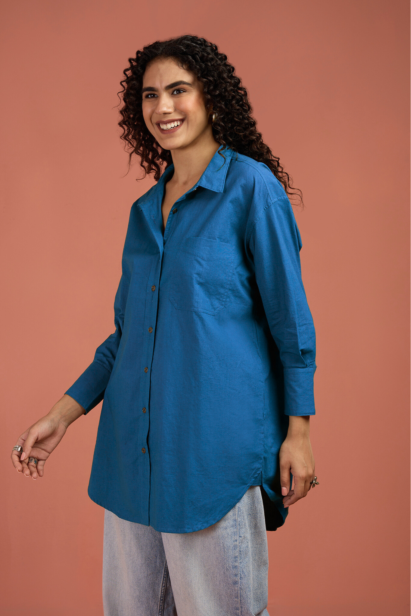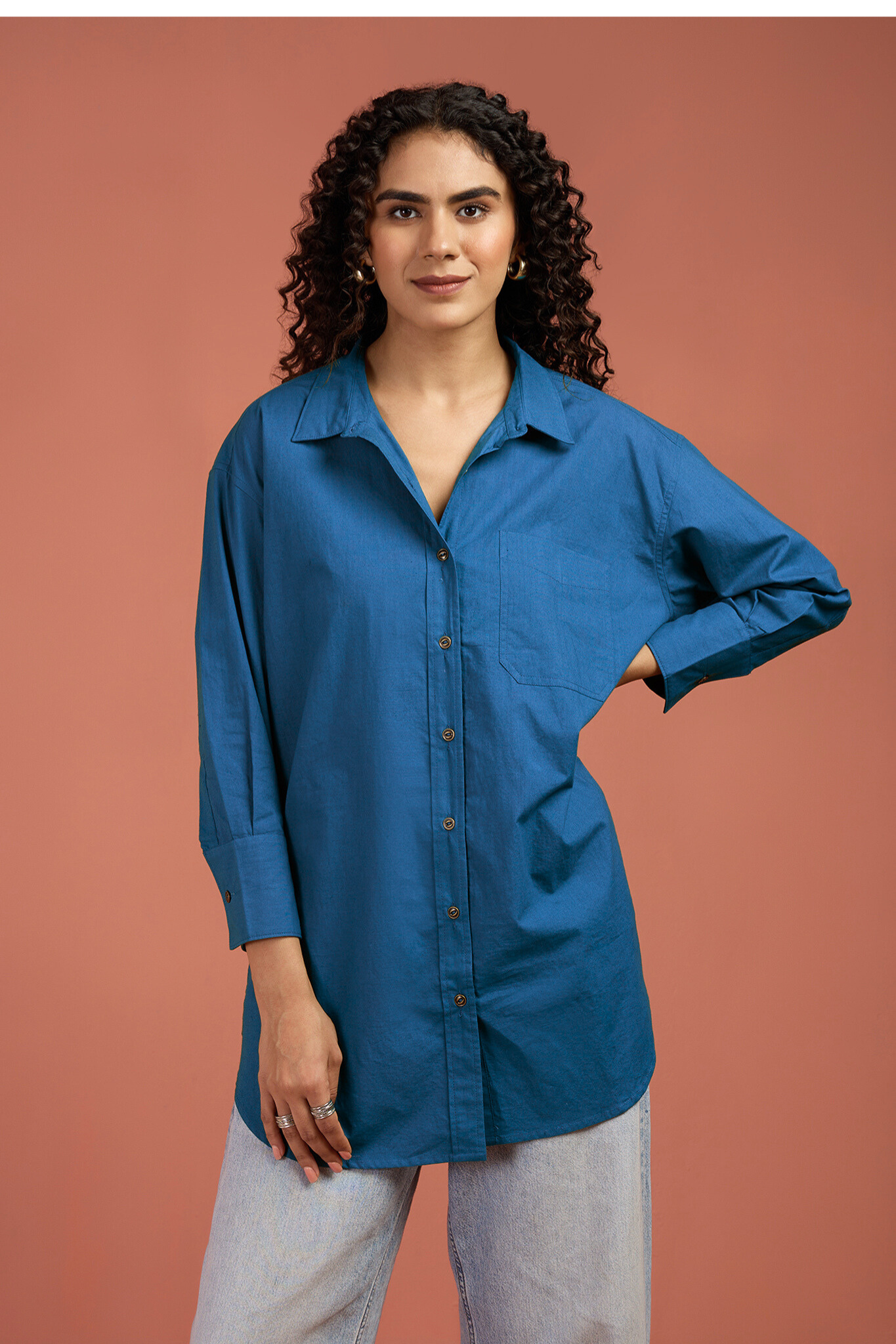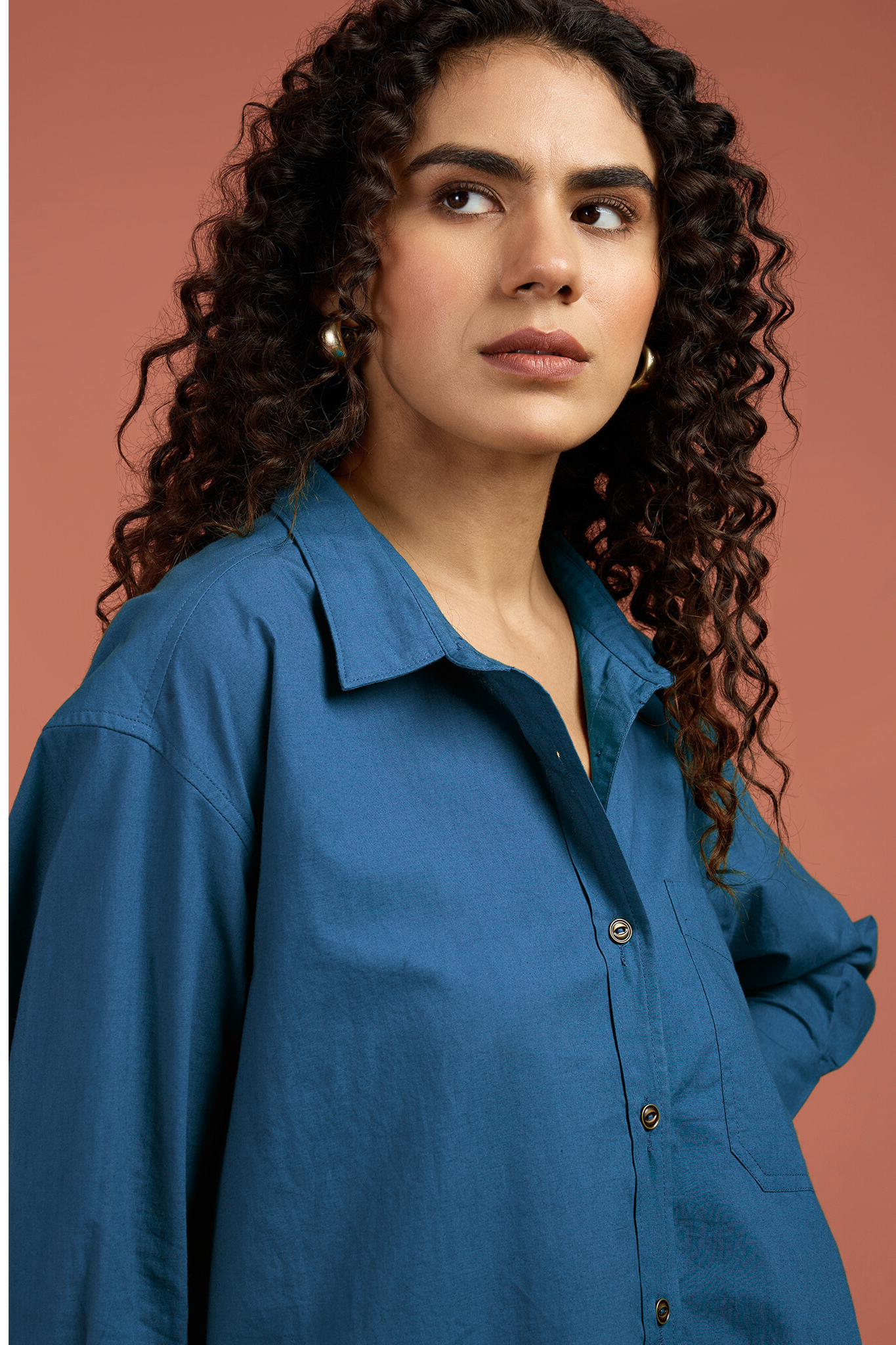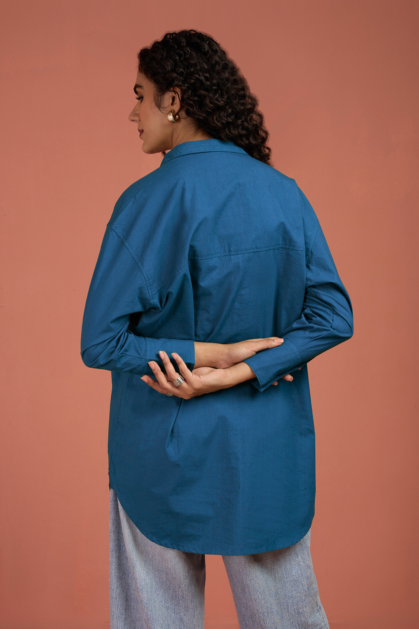 A modern classic with a nautical edge. Designed in solid navy blue, this oversized cotton shirt balances structure and ease with its longline cut, patch pocket, and curved hem. The deep hue adds quiet sophistication, making it a versatile piece to wear on repeat. Styling Note: Button it up with tailored pants for workday polish, or throw it over shorts and dresses as a beach-ready overshirt. Luxury in every detail at Maati.