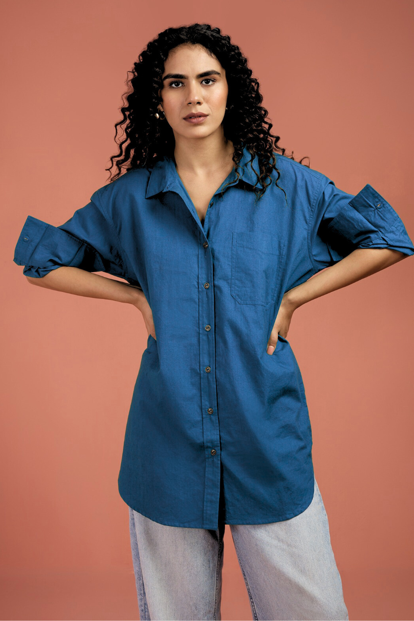 Oversized Long Shirt In Blue Poplin Cotton  by Maati Crafts