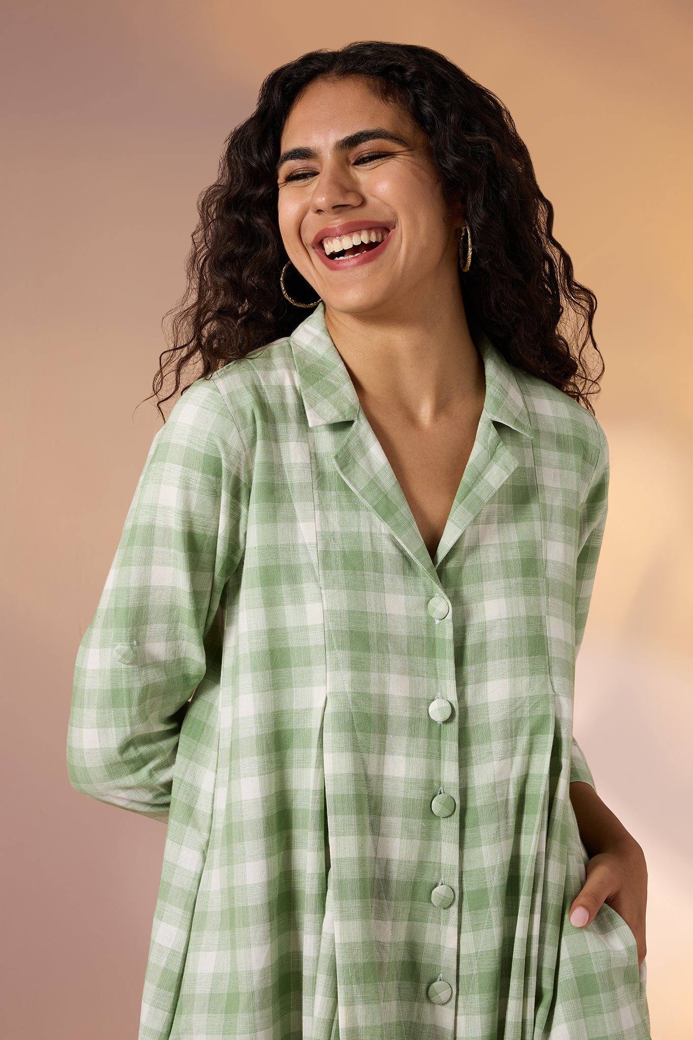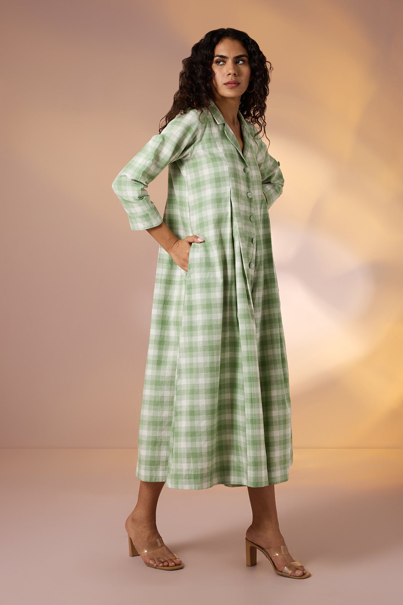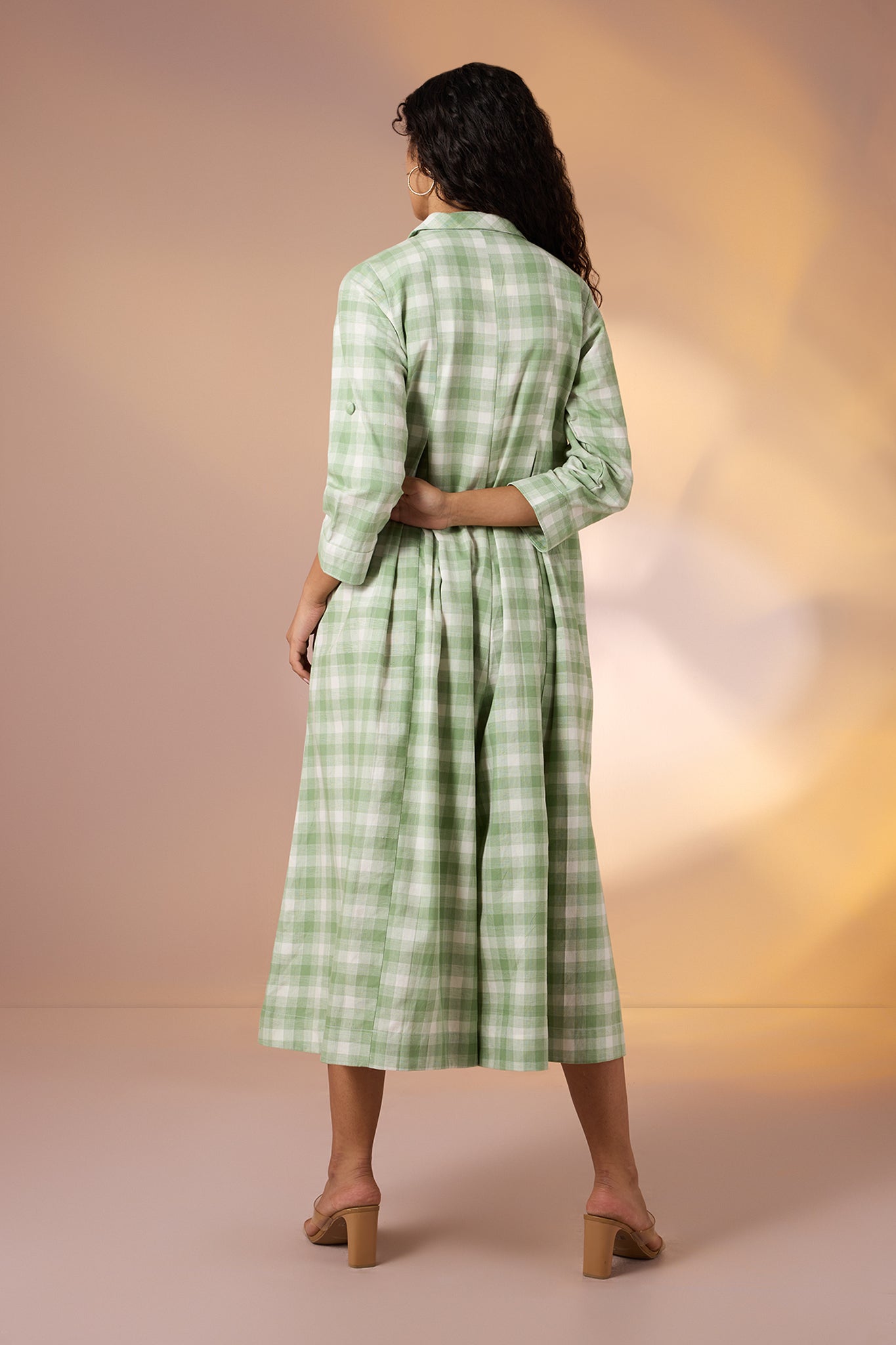 Handcrafted in breathable cotton, this flared jumpsuit is a refreshing take on effortless elegance. Dipped in soothing mint green hues and adorned with a soft checkered print all over, it combines comfort with timeless charm. The collared neckline and button-down front, finished with handcrafted buttons, add a tailored touch, while 3/4th sleeves balance structure with ease. Its flared silhouette lends graceful movement, making it as versatile as it is stylish. A Maati bestseller, this jumpsuit is elegantly designed to take you from casual brunches to evening get-togethers with minimal effort.Pair it with flat sandals and a tote for daytime ease, or dress it up with block heels and statement earrings for an elevated evening look.