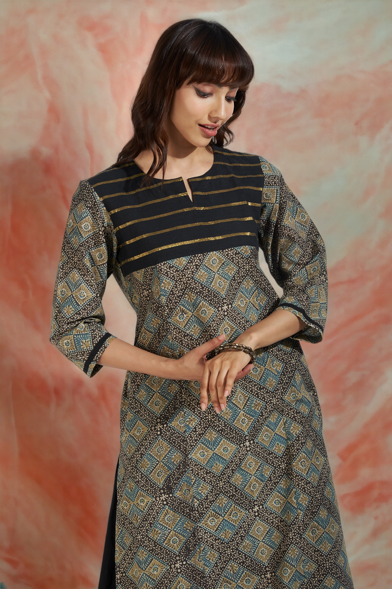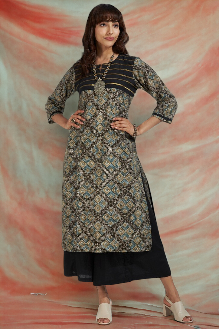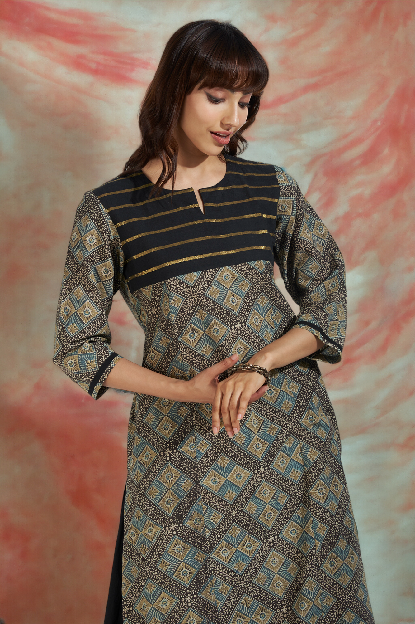 A harmonious blend of bold design and intricate craftsmanship. This kurta stands as a testament to our commitment to combining striking elements that result in a stunning visual symphony. The yoke features bold gold and black stripes meticulously arranged to form a captivating geometric pattern that exudes modernity and confidence. This design seamlessly flows into the coffee-toned ajrakh pattern, evoking a sense of vintage charm in hues of natural indigo and brown.