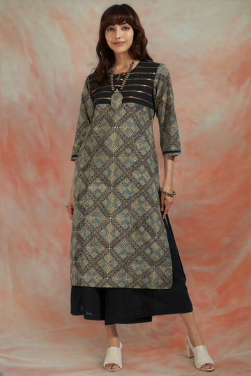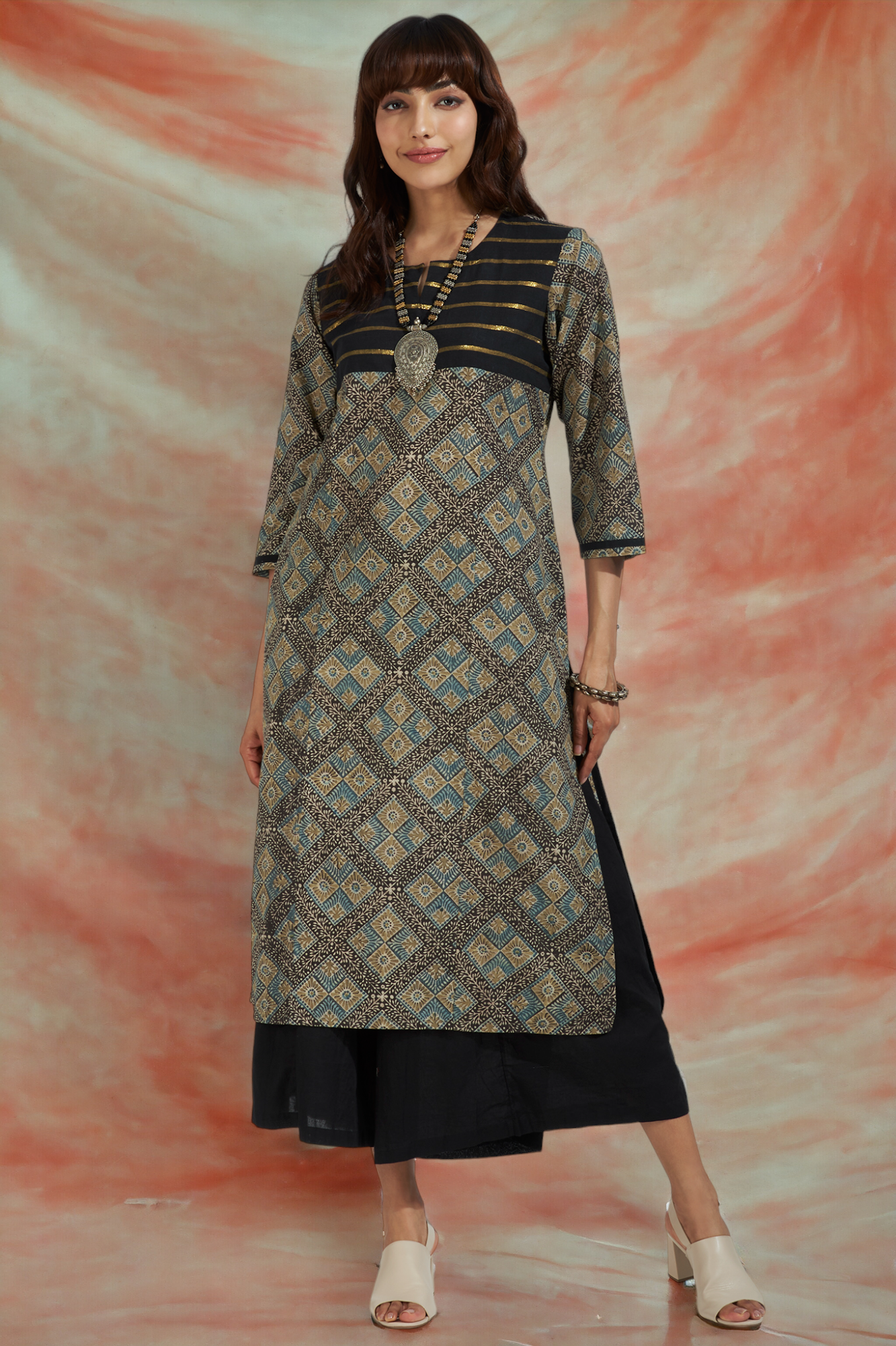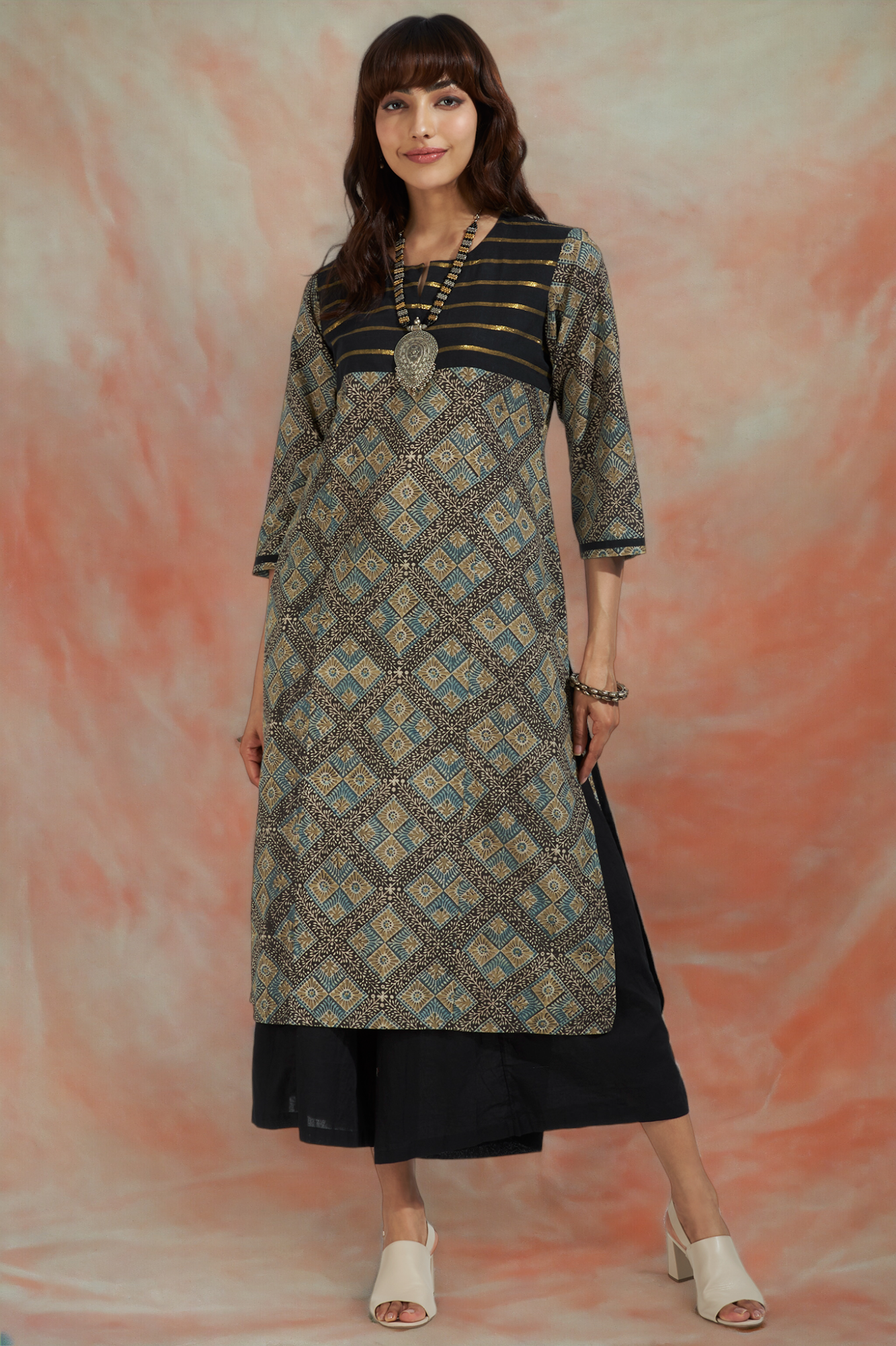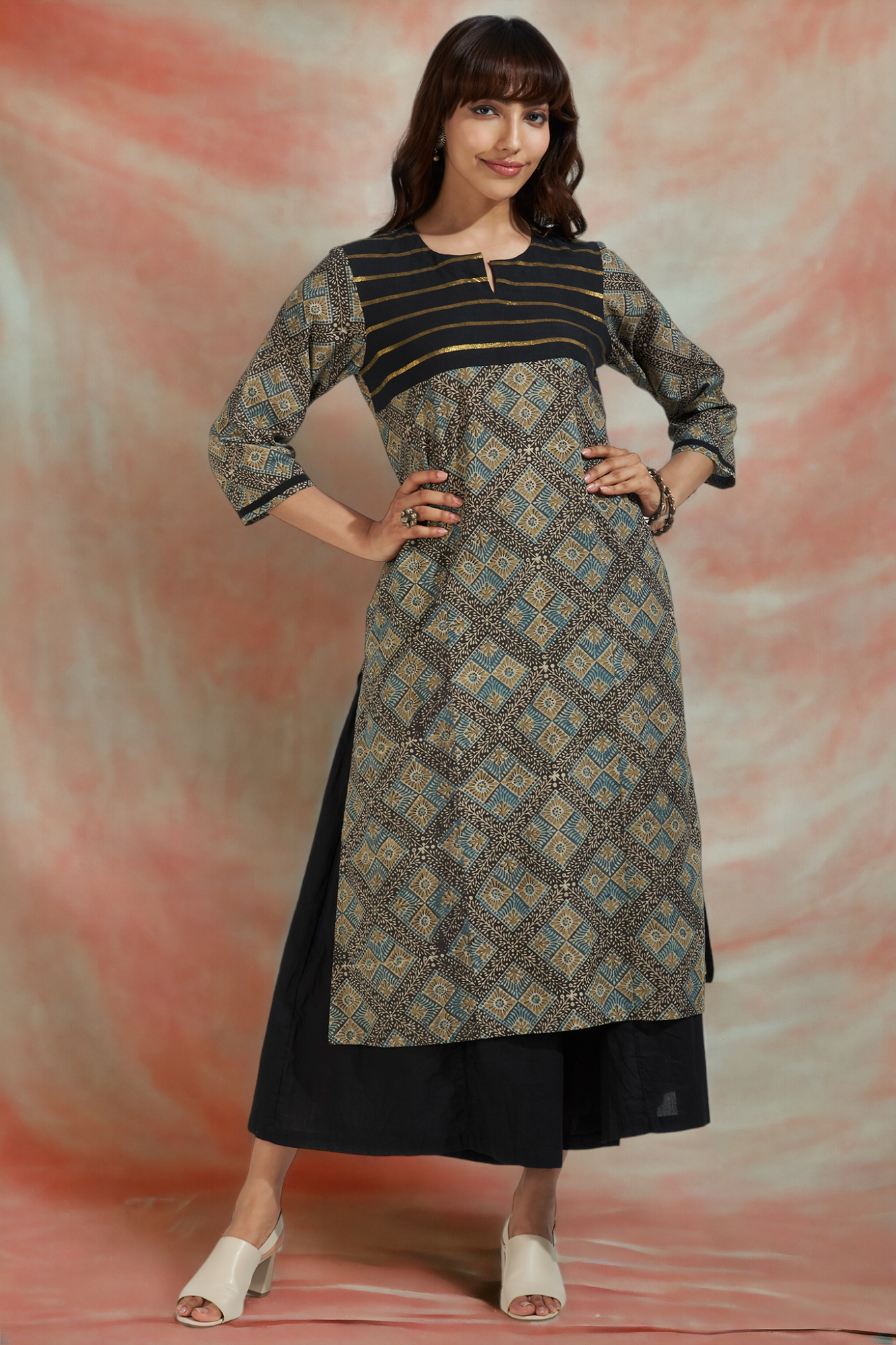 A harmonious blend of bold design and intricate craftsmanship. This kurta stands as a testament to our commitment to combining striking elements that result in a stunning visual symphony. The yoke features bold gold and black stripes meticulously arranged to form a captivating geometric pattern that exudes modernity and confidence. This design seamlessly flows into the coffee-toned ajrakh pattern, evoking a sense of vintage charm in hues of natural indigo and brown.