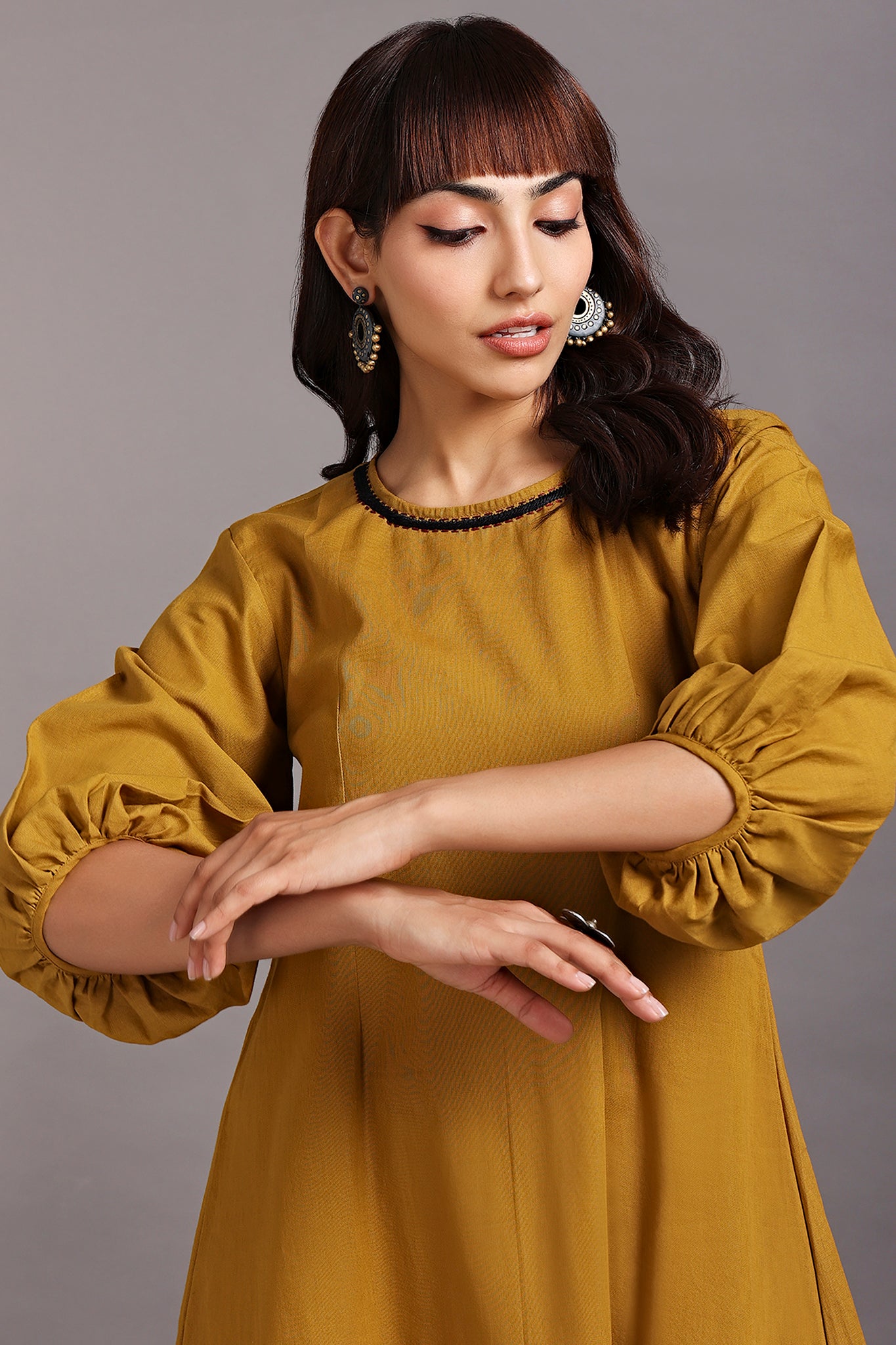 Step up your style game with our stunning ochre yellow applique dress! Made from premium cotton and applique technique, this romantic dress with floral accents, is flirty yet elegant for any occasion. The accentuated peasant sleeves and flattering waistline will make a statement, making you feel gorgeous wherever you go. Dress it up with some pumps or heels for a formal evening look, or keep it casual with sandals for a quick getaway with friends. Either way, this dress is sure to become a staple in your wardrobe!!! The dress is handcrafted by our karigars at out atelier in Mumbai and hand embroidered with stitch detail on neckline with green thread to elevate the look! The dress has a deep boond at the back for a perfect fit & look!
