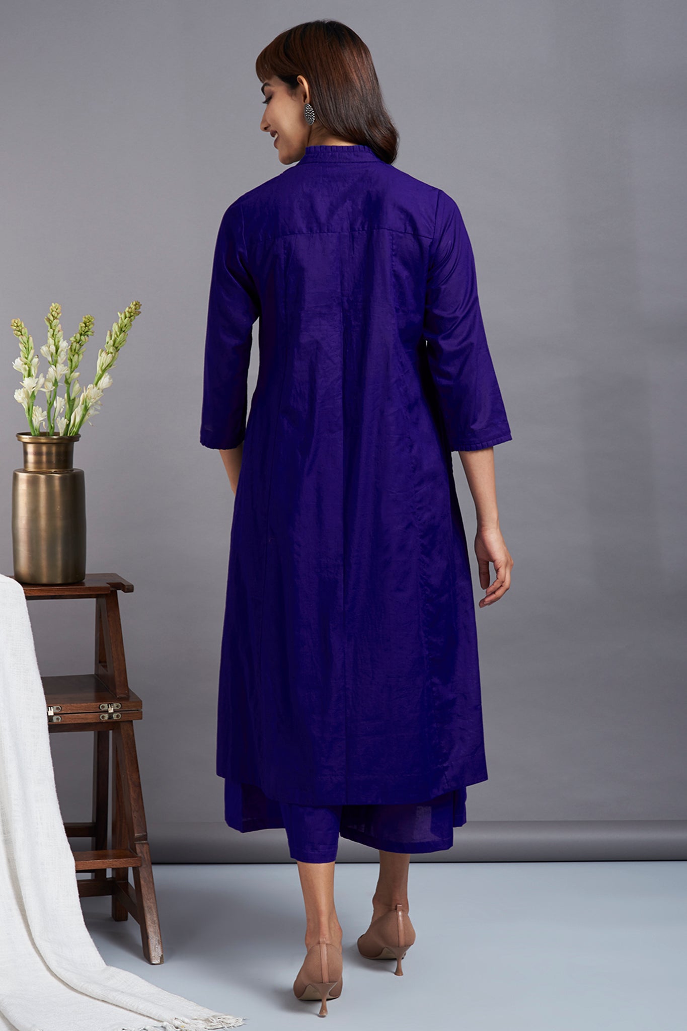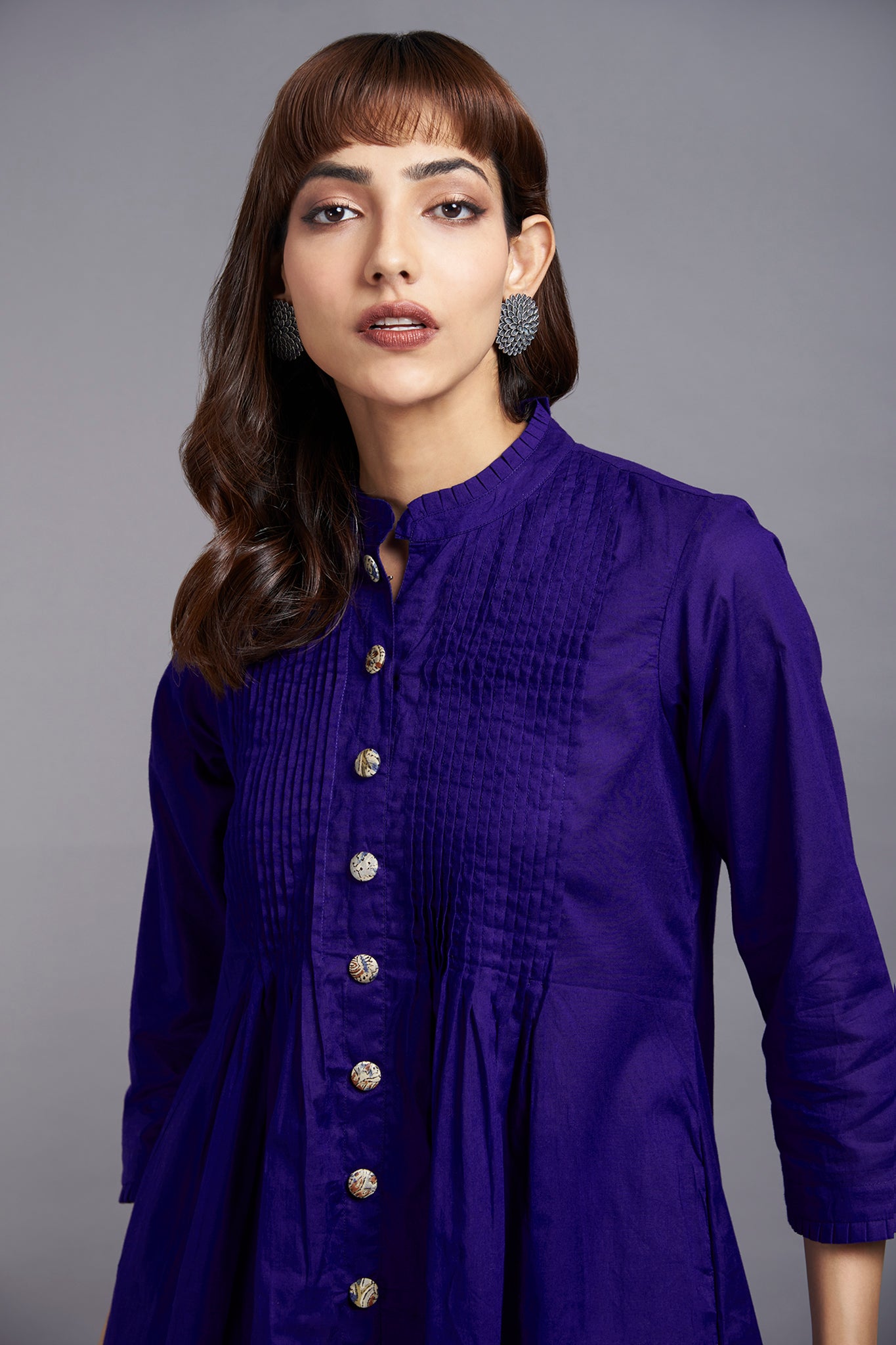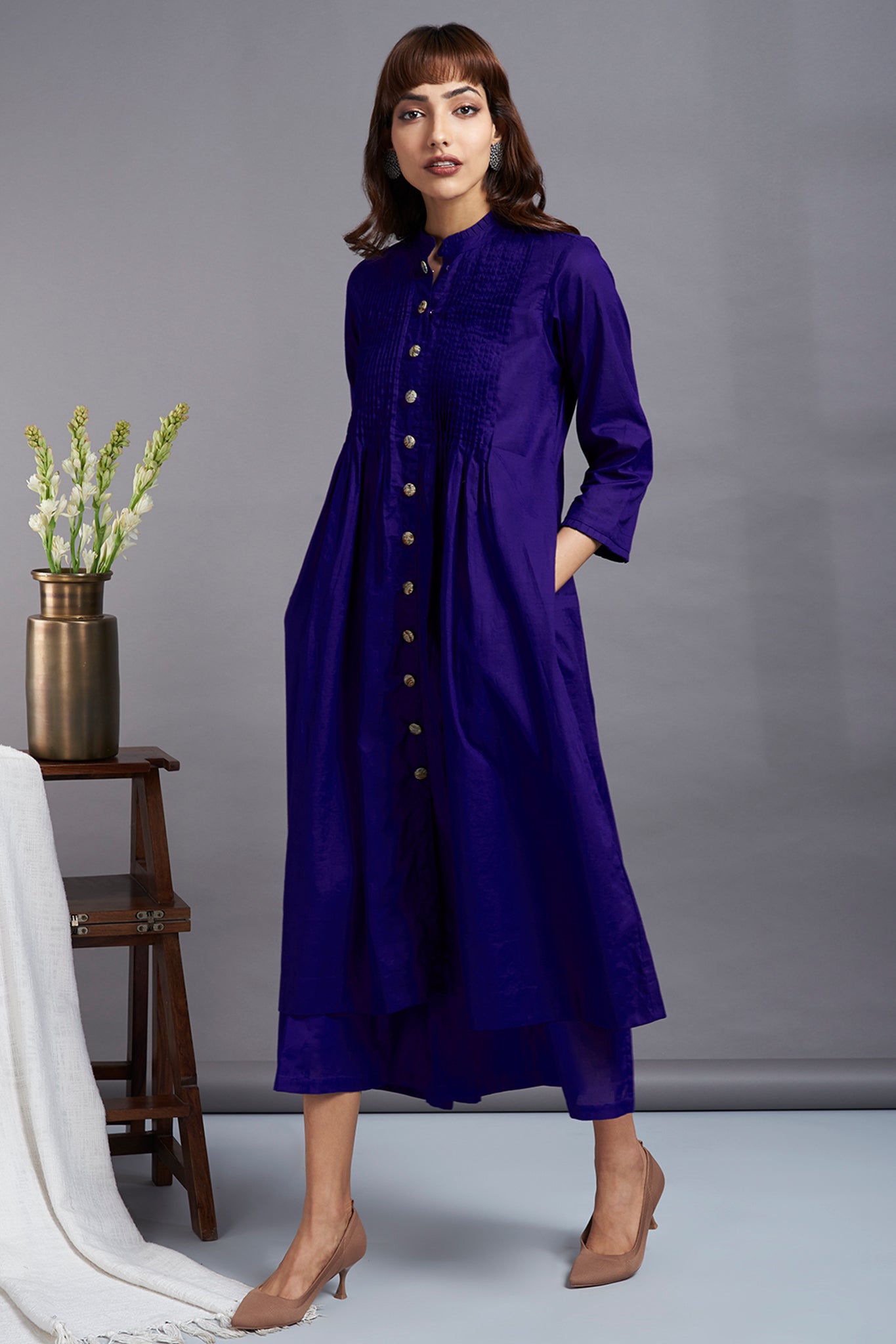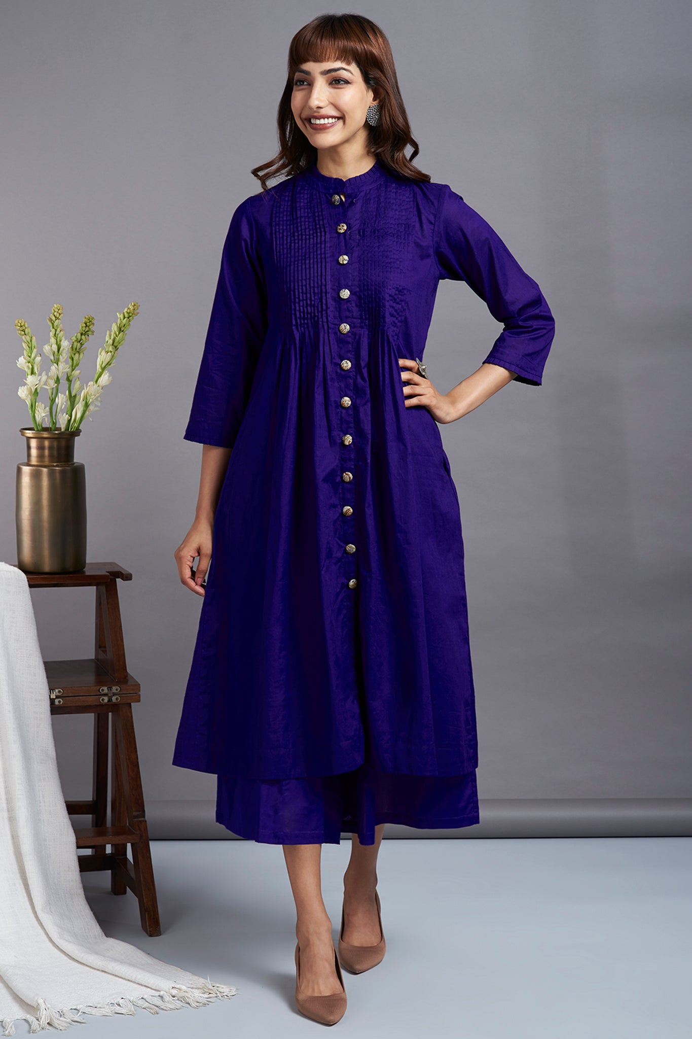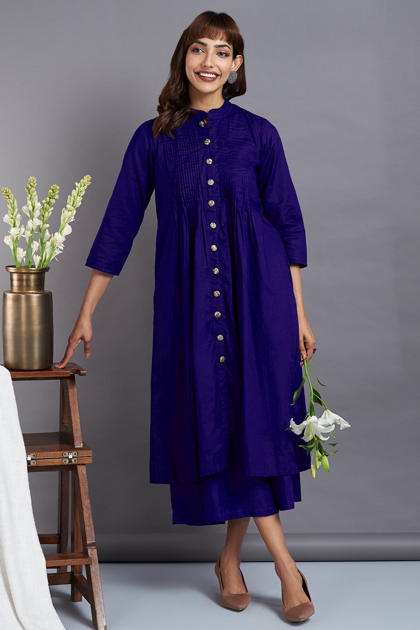 Handcrafted in delicate cotton in vibrant hues of purple, this dress has a beautiful feminine look. Super-soft cotton, elegantly pintucked on the front yoke and finished with handmade buttons all over for styling. finished with dainty ruffle details on the neckline & sleeves. This button-down dress can be styled as a  dress by itself, or as a co-ord with monotone culotte available separately in same colour. A great outfit to stock up in your closet, perfect to wear as a dress for your holidays or perfect for your workwear with our culottes! The fabric is sourced from Mumbai, Maharashtra, and stitched, hand finished at our atelier in Mumbai, Maharashtra.
