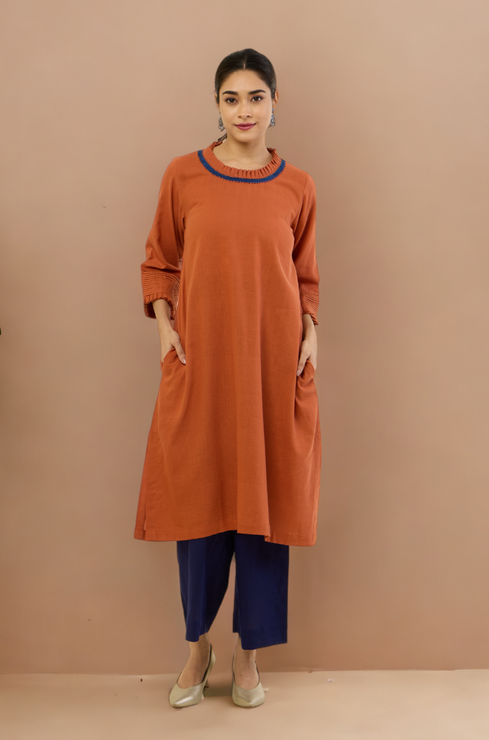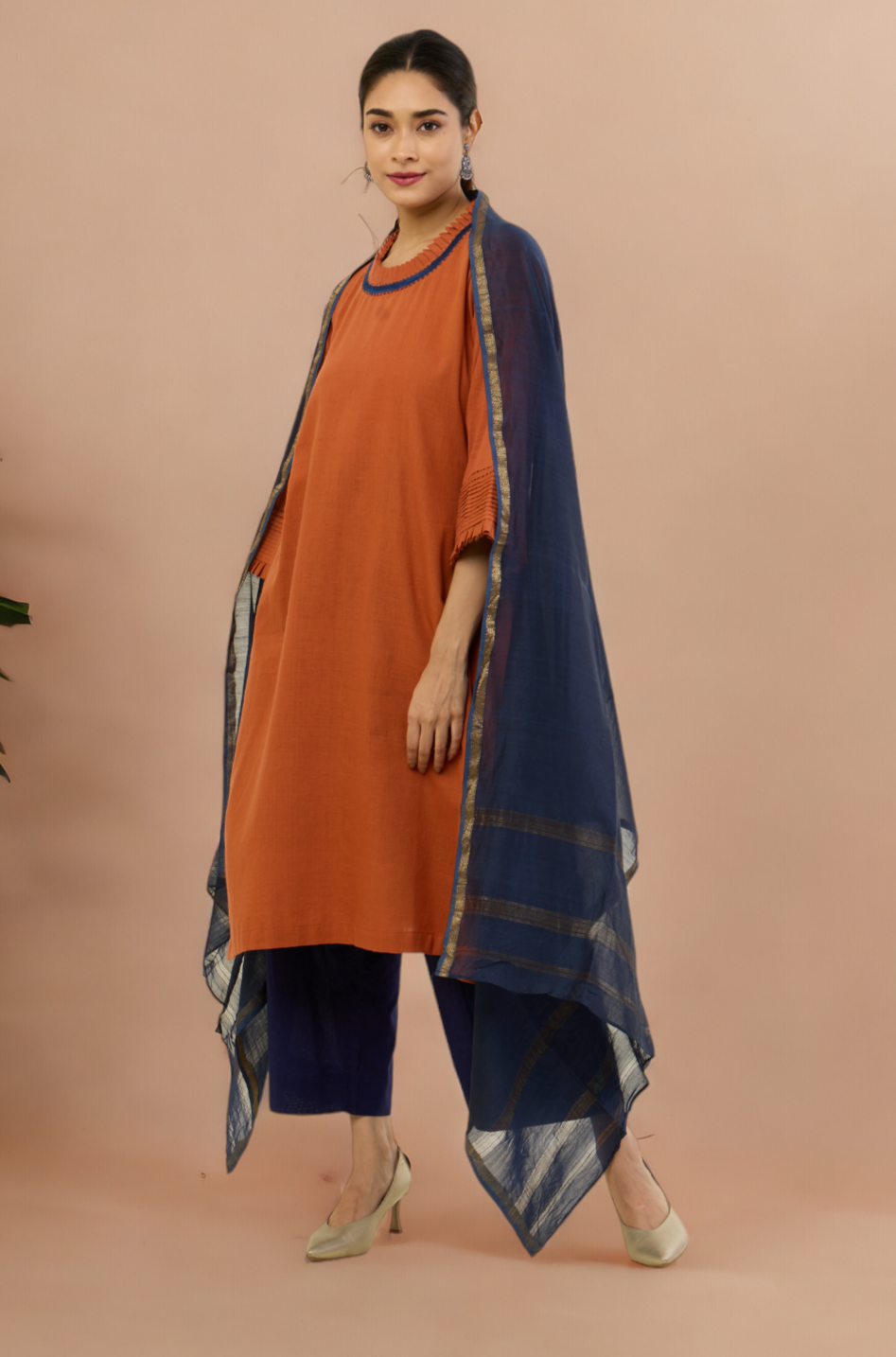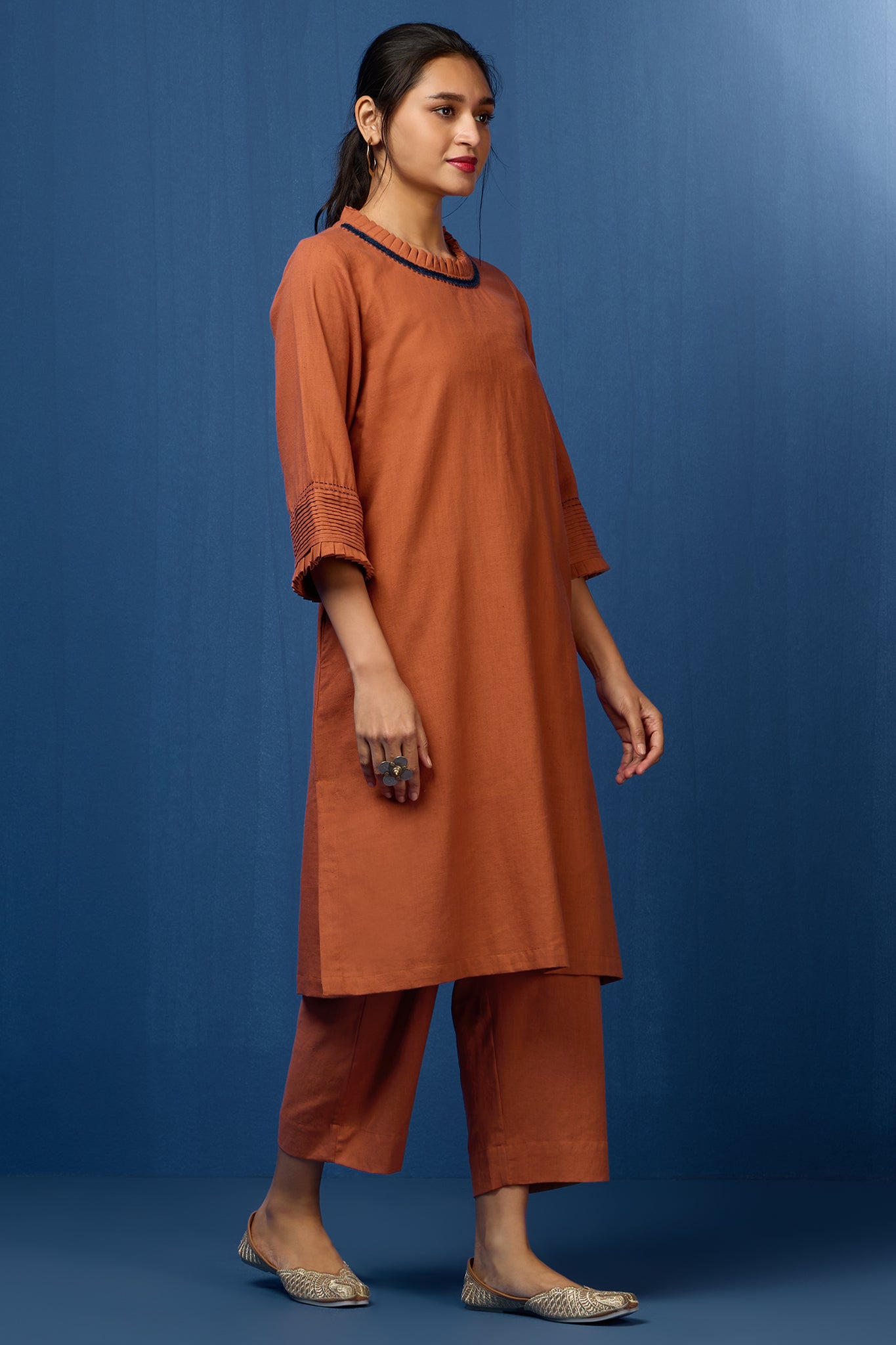 Styling Tip: Pair this earthy copper rust ensemble with neutral-toned accessories for a chic daytime look. Add a statement belt to accentuate the waist and complement the sophisticated embroidered details. Complete the ensemble with similar colour pants for a formal look, your favorite heels for an effortlessly stylish appearance that seamlessly transitions from day to night.