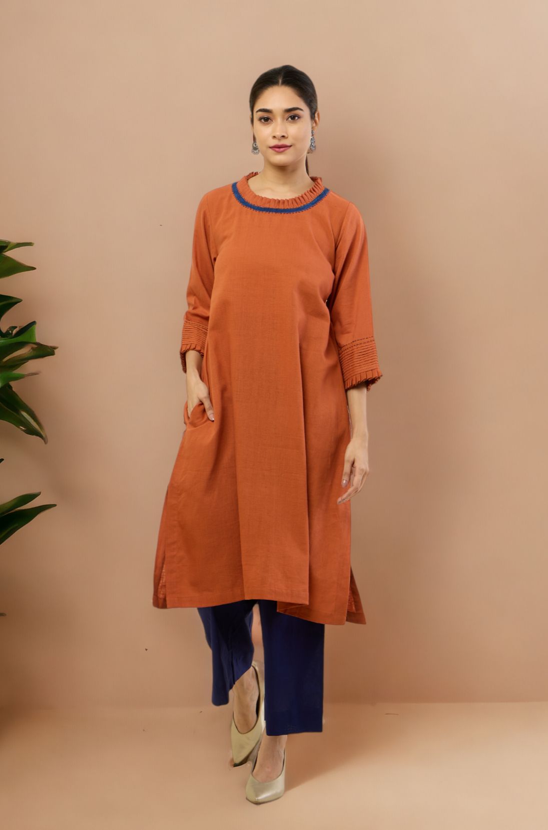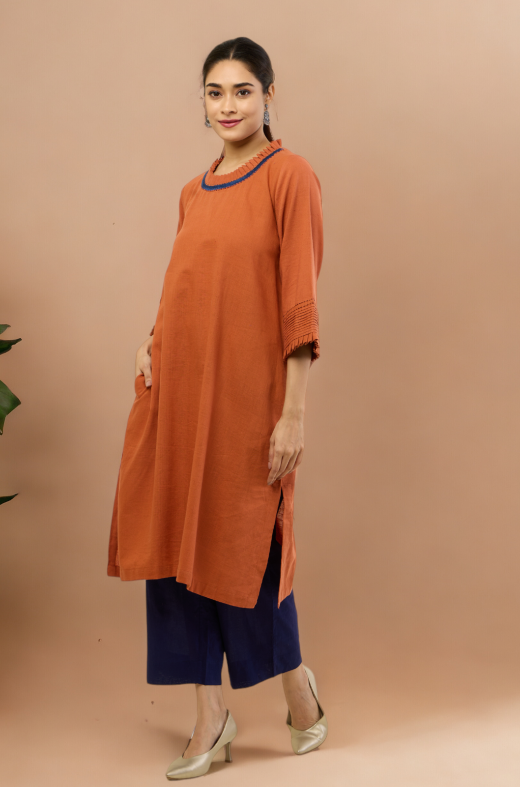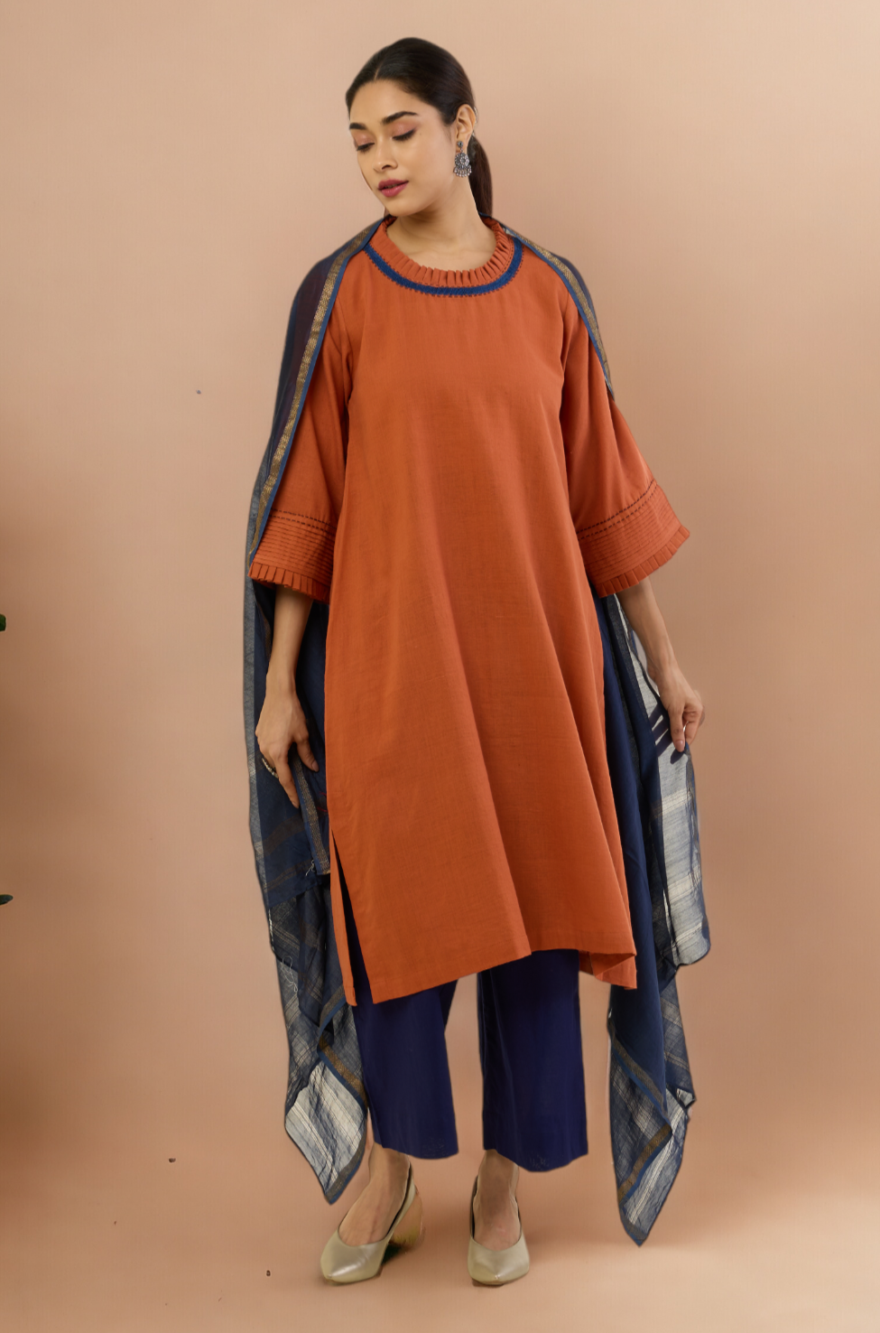 Styling Tip: Pair this earthy copper rust ensemble with neutral-toned accessories for a chic daytime look. Add a statement belt to accentuate the waist and complement the sophisticated embroidered details. Complete the ensemble with similar colour pants for a formal look, your favorite heels for an effortlessly stylish appearance that seamlessly transitions from day to night.