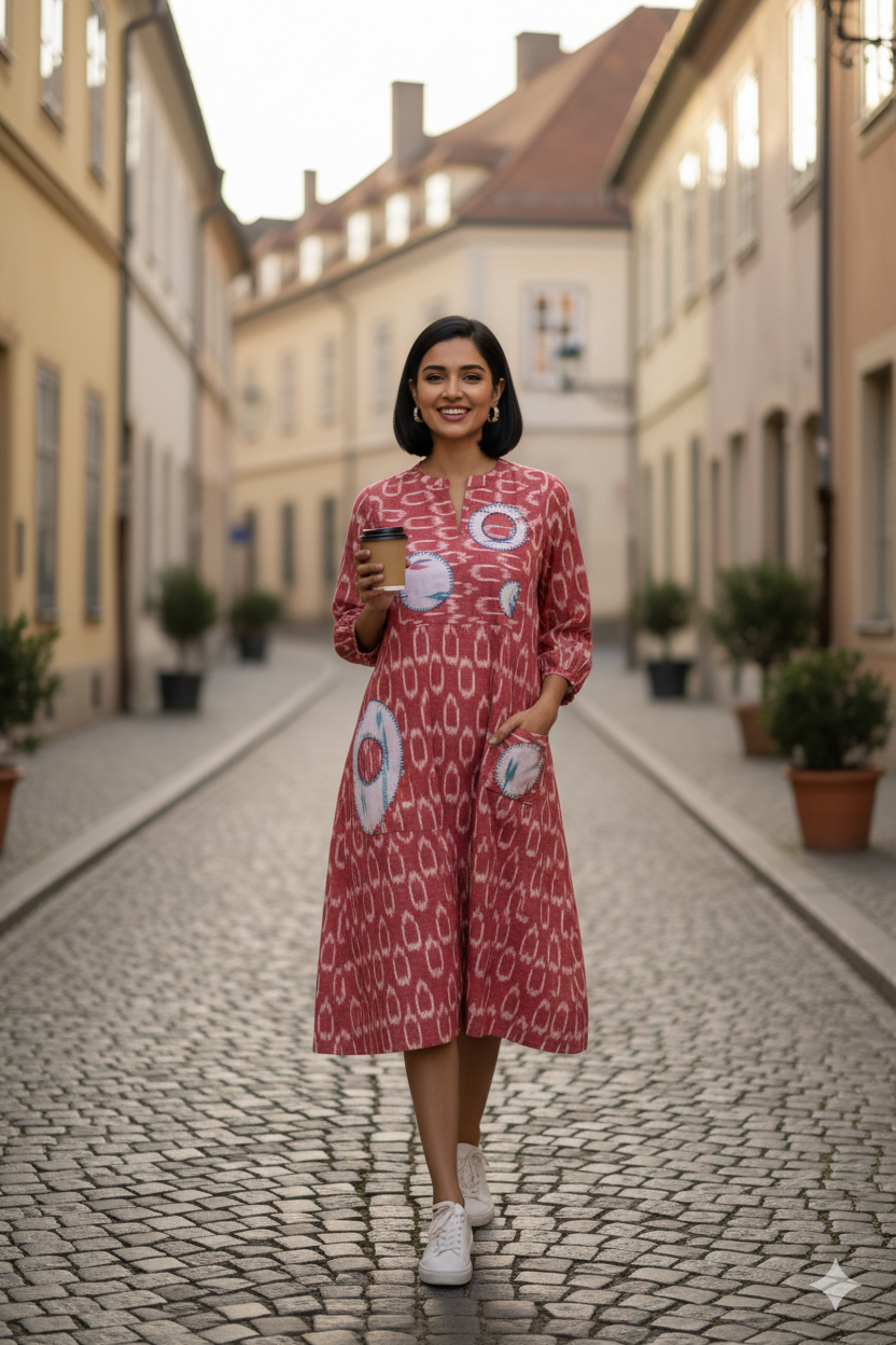 Step into refined elegance with our 100% Cotton Dress, crafted in soothing pink and white hues that evoke serenity and sophistication. This versatile piece features hand-appliqué embroidery in white ikat circles, adding artisanal charm to the minimalist design. The round neckline and subtle gathered sleeves enhance its modern silhouette, while a practical patch pocket offers both style and functionality. Tailored for a flattering fit, this dress transitions seamlessly from workwear to weekend chic. Wear it as a tunic or a dress—its effortless versatility makes it perfect for any occasion. Pair with matching ikat pants (sold separately) for a coordinated, understated look.
