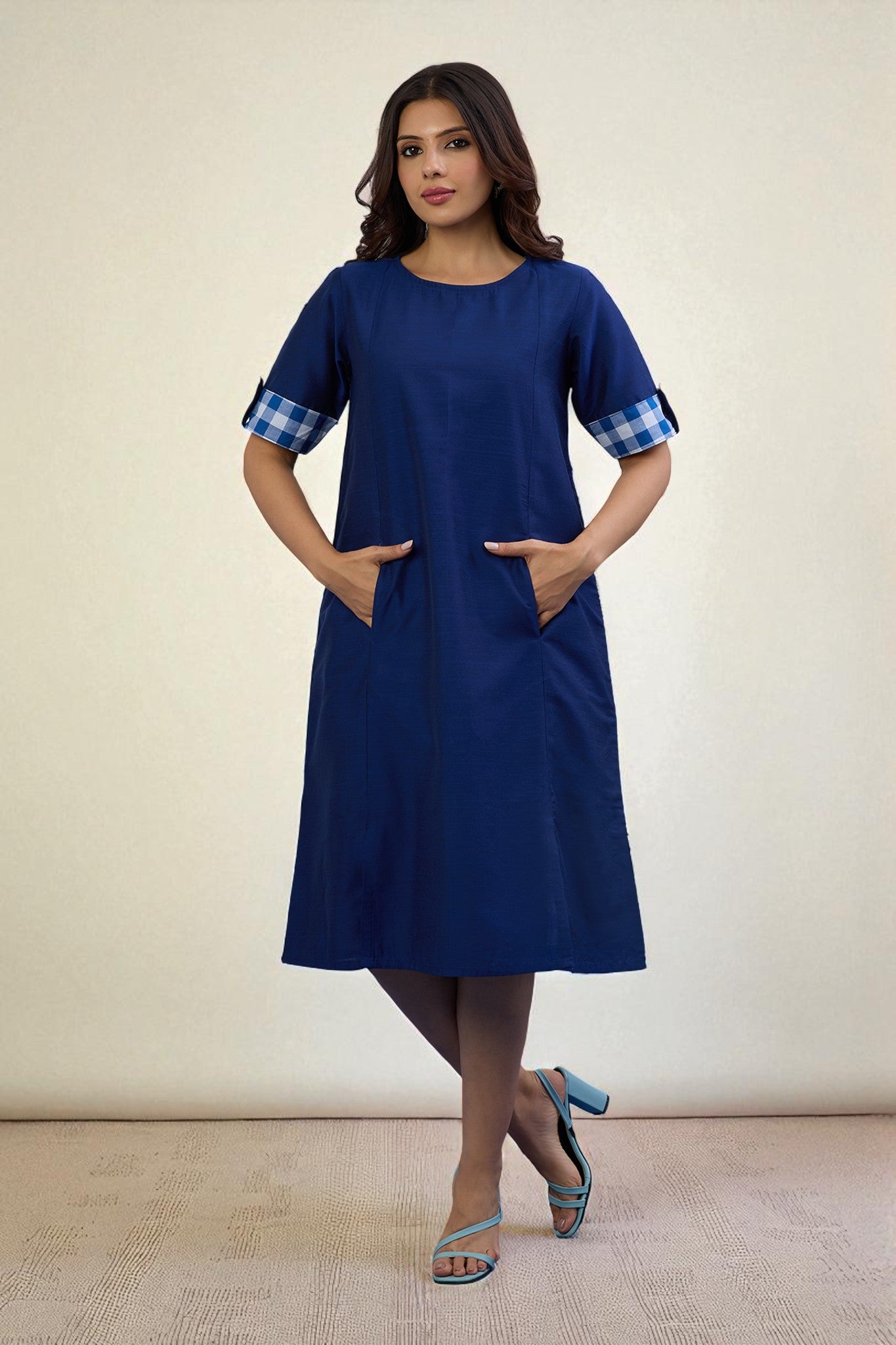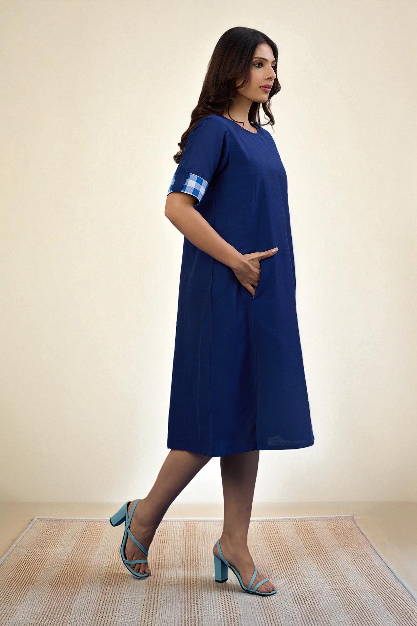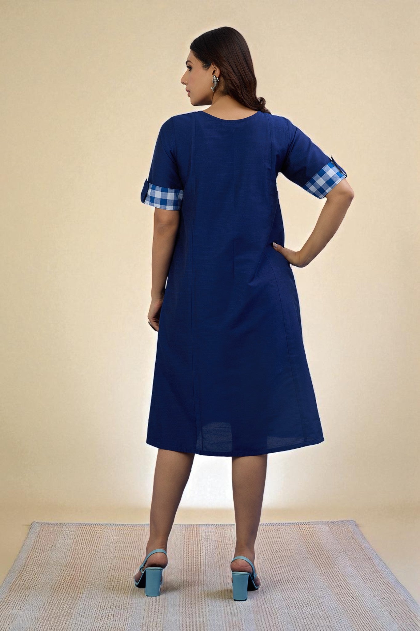 Make a statement in our Solid Indigo Dress, crafted in 100% cotton for effortless comfort and timeless appeal. This midi-length silhouette is designed in deep indigo hues, elevated with subtle trims of indigo checks that add a touch of artisanal detail. Short sleeves with checked cuff accents bring refined structure, while front slits lend ease of movement and modern charm. Thoughtfully finished with functional pockets, it balances practicality with elegance. Versatile and contemporary, this dress is perfect for long holidays, casual dates, or relaxed evening strolls—a true wardrobe essential that redefines everyday chic with a handcrafted twist.