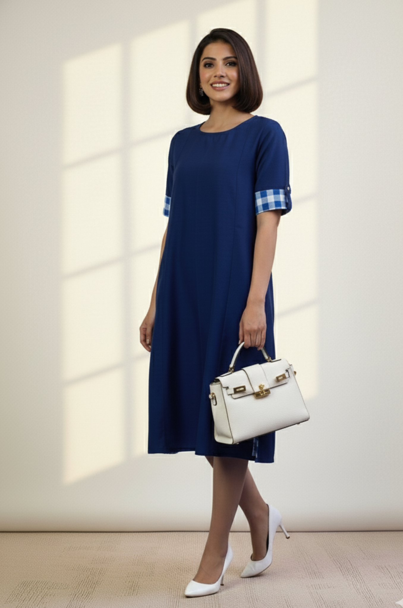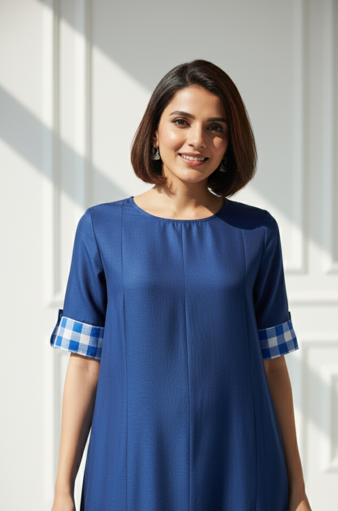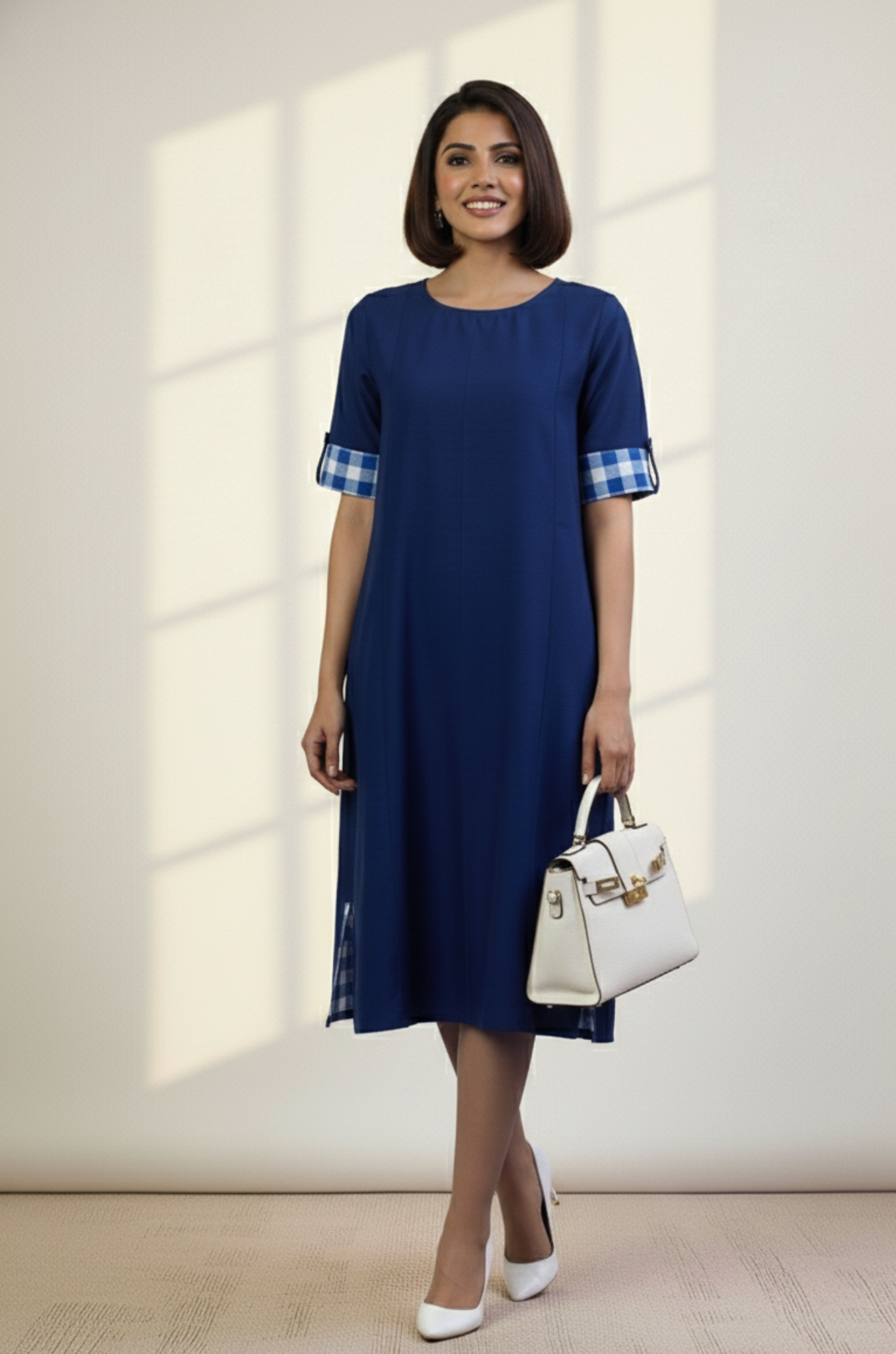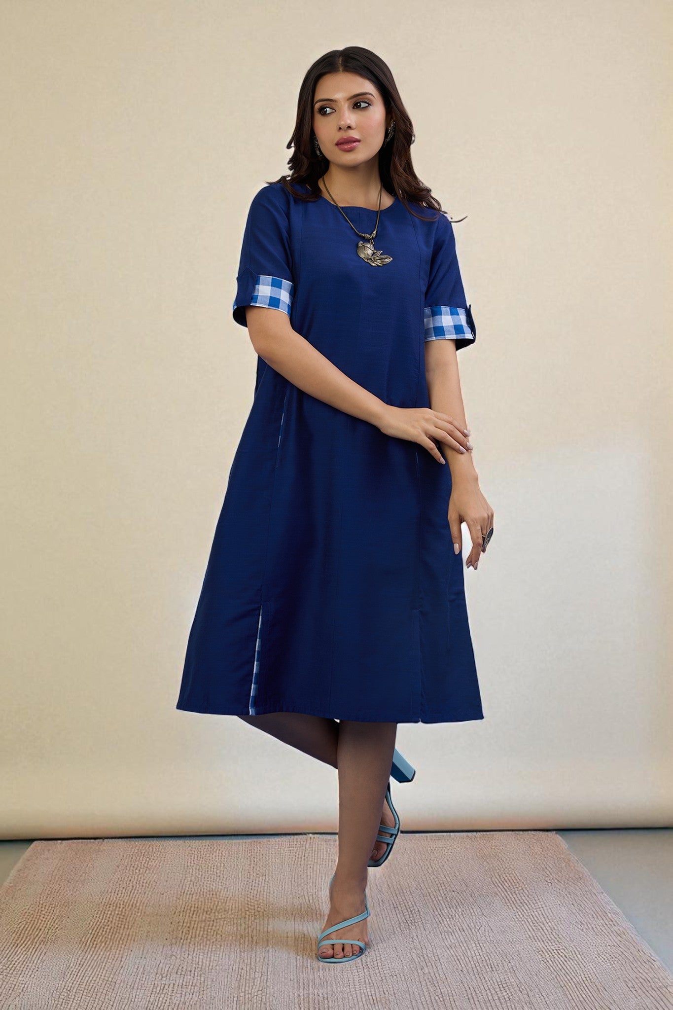 Make a statement in our Solid Indigo Dress, crafted in 100% cotton for effortless comfort and timeless appeal. This midi-length silhouette is designed in deep indigo hues, elevated with subtle trims of indigo checks that add a touch of artisanal detail. Short sleeves with checked cuff accents bring refined structure, while front slits lend ease of movement and modern charm. Thoughtfully finished with functional pockets, it balances practicality with elegance. Versatile and contemporary, this dress is perfect for long holidays, casual dates, or relaxed evening strolls—a true wardrobe essential that redefines everyday chic with a handcrafted twist.