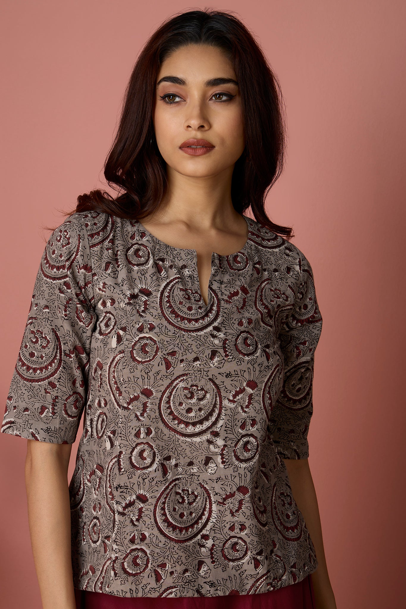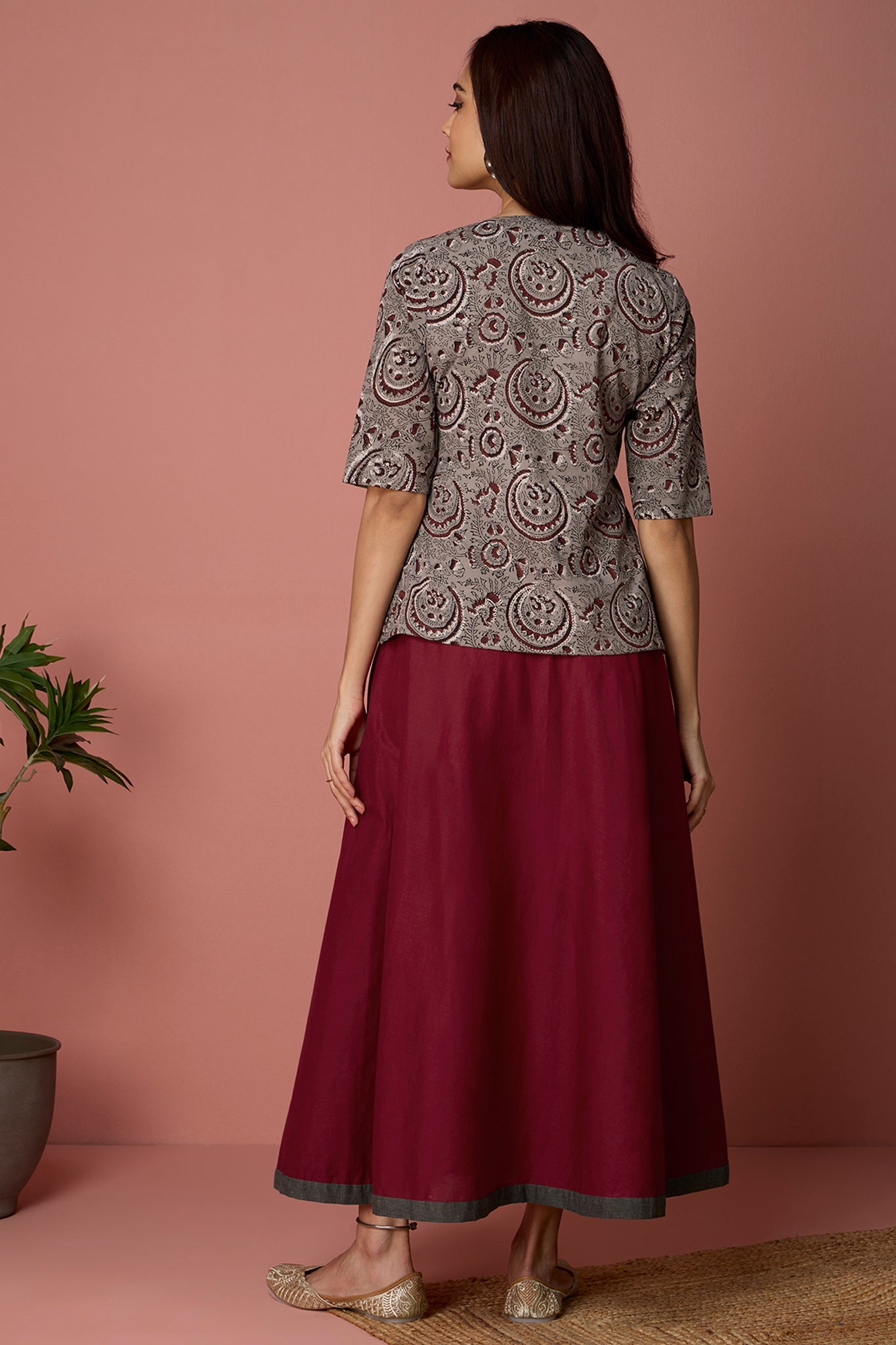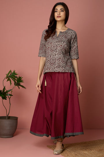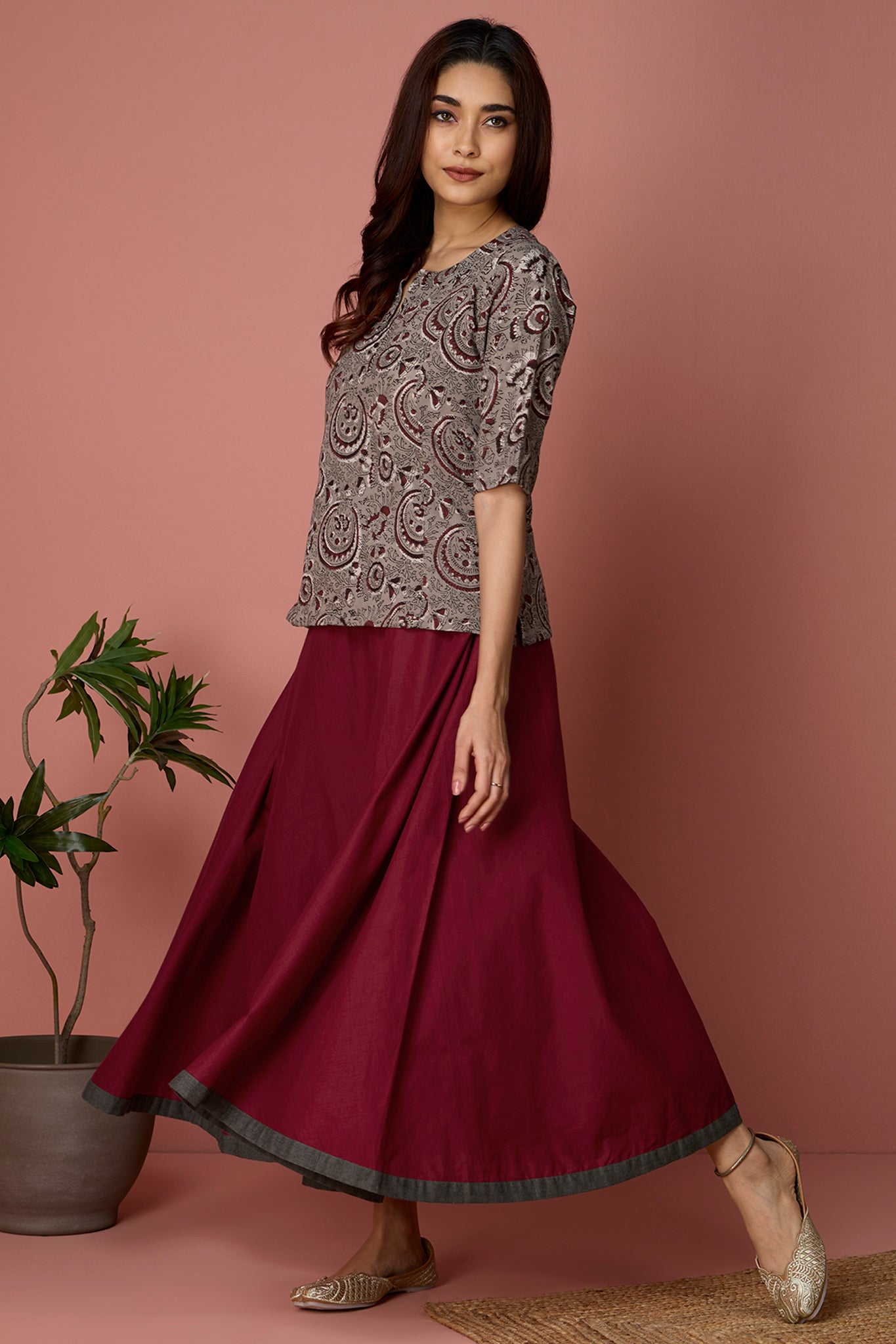 - Artisan Finish: Immerse yourself in the artistry of our atelier, where master artisans have meticulously tailored every inch. The accompanying crop top is a vision of tailored perfection, with short sleeves adding a touch of chic charm. Handblock printed in natural dyes, it showcases delicate motifs in captivating hues of grey, creating a harmonious blend with the swirl skirt.