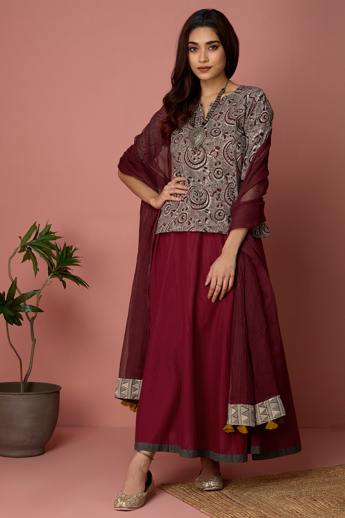 - Craftsmanship: Revel in the dance of colors with the tie-up waist and exquisite detailing. This piece is a masterpiece in maroon, with a touch of golden elegance that makes it perfect for festive gatherings or lively parties.