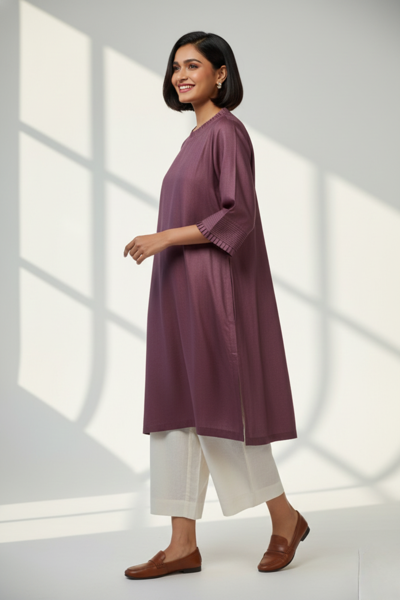 Designed to perfection, this ensemble can be worn as a standalone dress or paired with our smoke lemon modal bottoms, complemented by a soft silver dupatta for a complete look. The soft and tailored fit, combined with the high-quality fabric, ensures a luxurious feel against the body.