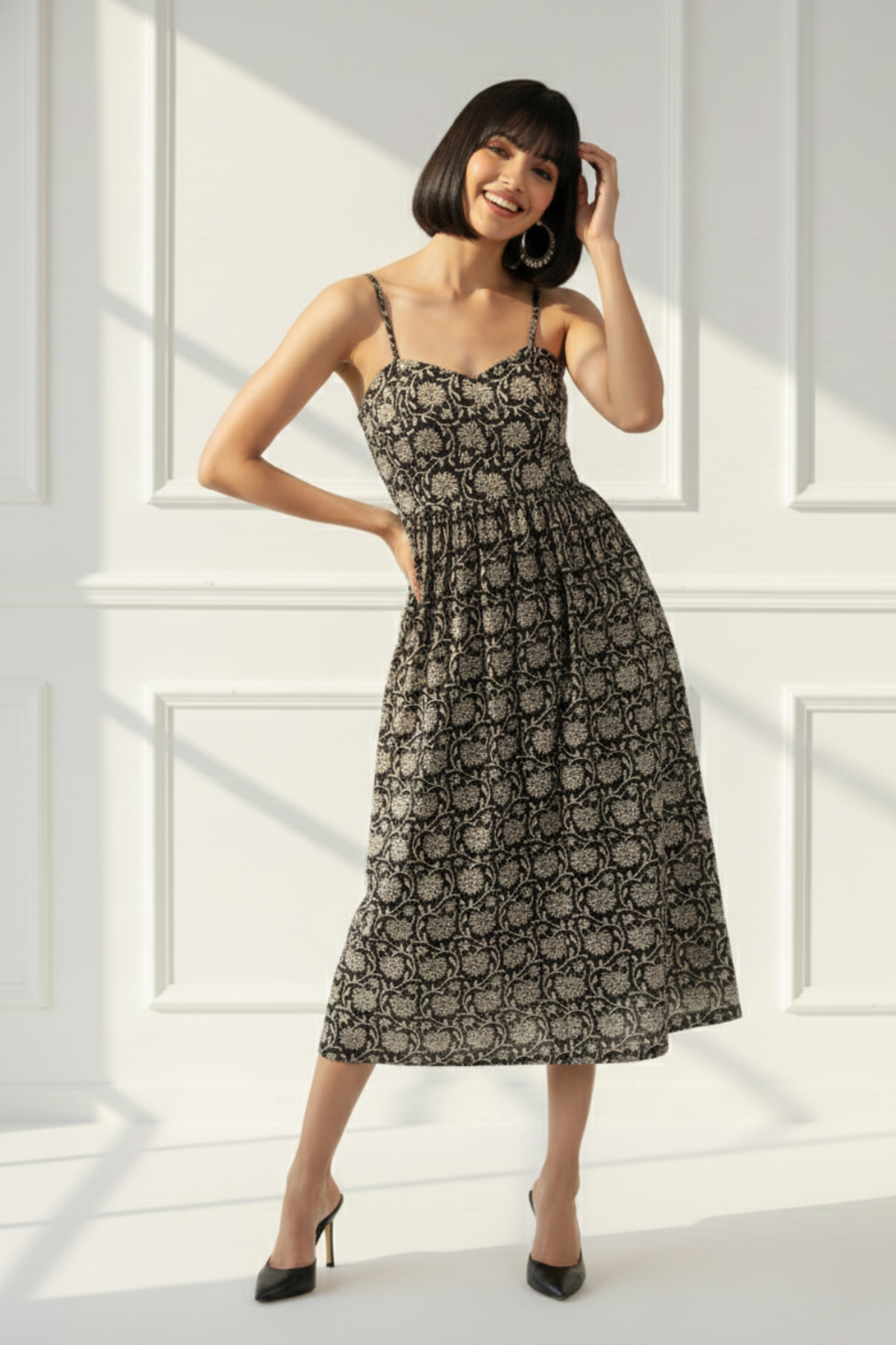 Glam up your festive brunches with this stunning strap dress in timeless shade of black. It is glamorous, chic & perfect to wear by itself or layering up your favourite vintage jackets or shrugs. Pair up some glam heels, gold hoops & bracelet stacks to style up an evening look. The fabric is sourced & hand block printed in Bagh, Madhya Pradesh hand hand finished at our atelier in Mumbai. Flamboyant florals in black & white make this outfit perfect for day or night. We love to style it up with sneakers for a casual travel look.