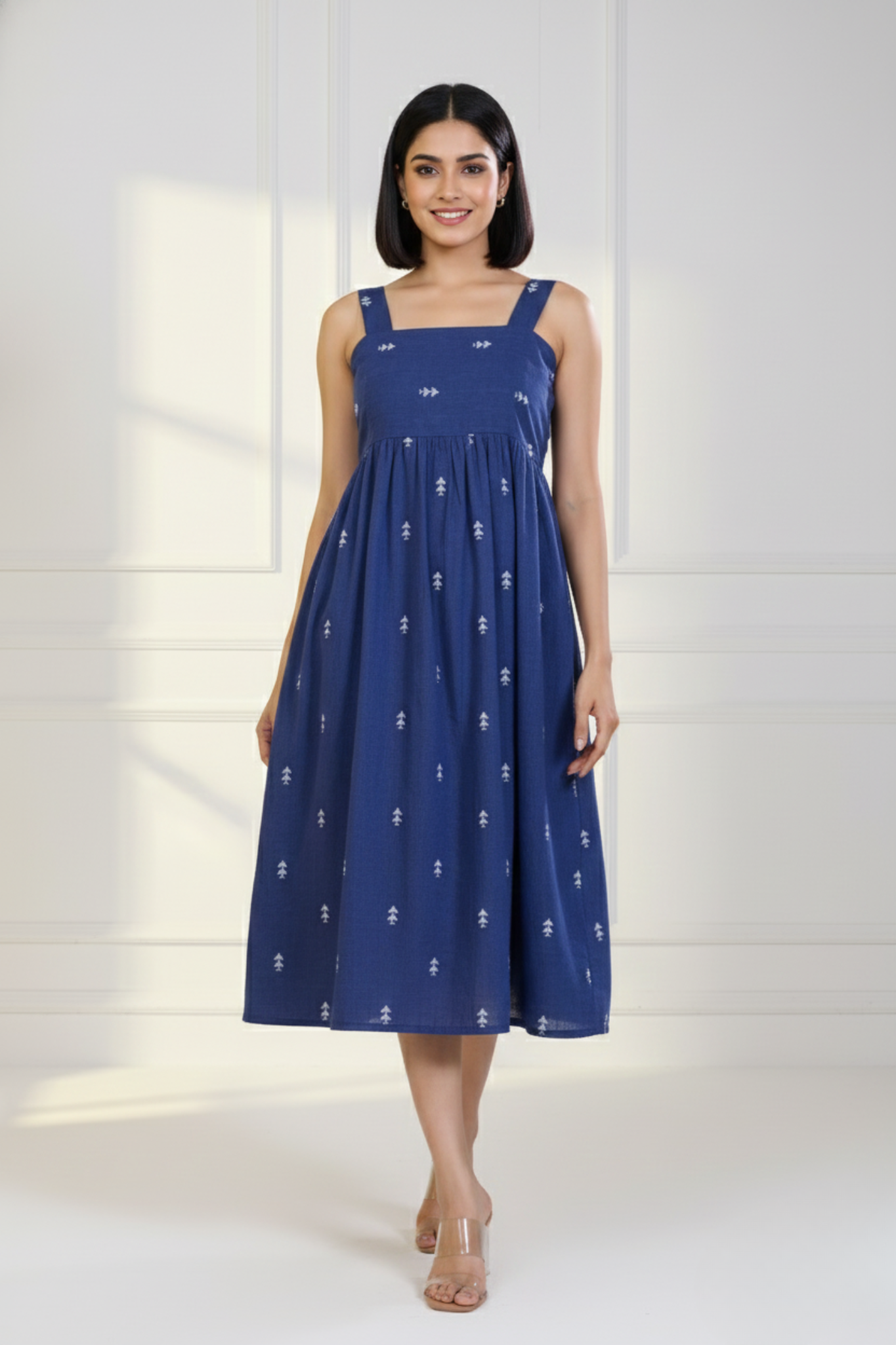 Embrace effortless charm with our Cotton Strap Dress, designed to elevate your style quotient. Crafted in a soothing indigo hue adorned with delicate white buttis, it exudes understated elegance. The perfect blend of style and comfort, its flattering fit makes it ideal for a romantic date night or for your wanderlust adventures. Tailored with precision and high-quality craftsmanship, this dress promises a silhouette that flatters every curve. Versatile and fluid, it transitions seamlessly throughout the seasons, whether worn solo as a dress or layered with your favorite pieces. Embody grace and versatility with this timeless addition to your wardrobe.