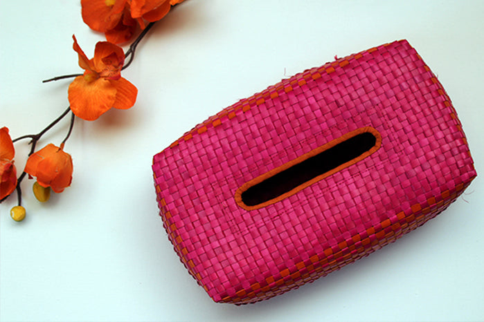 the ornamentation of these tissue boxes is done by a variety of methods and techniques. single and multi-color patterns obtained by skillfully manipulating the strips while weaving.