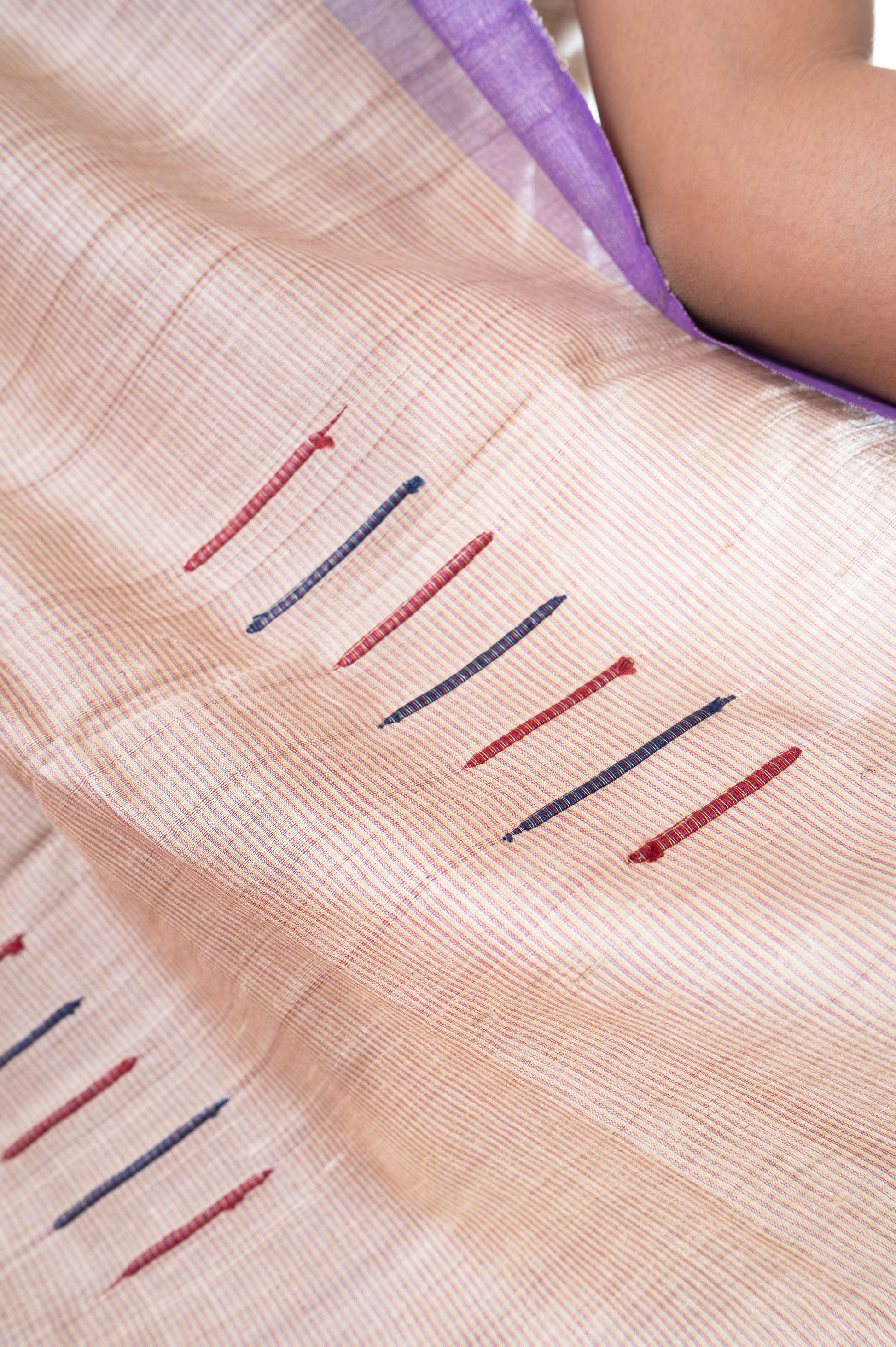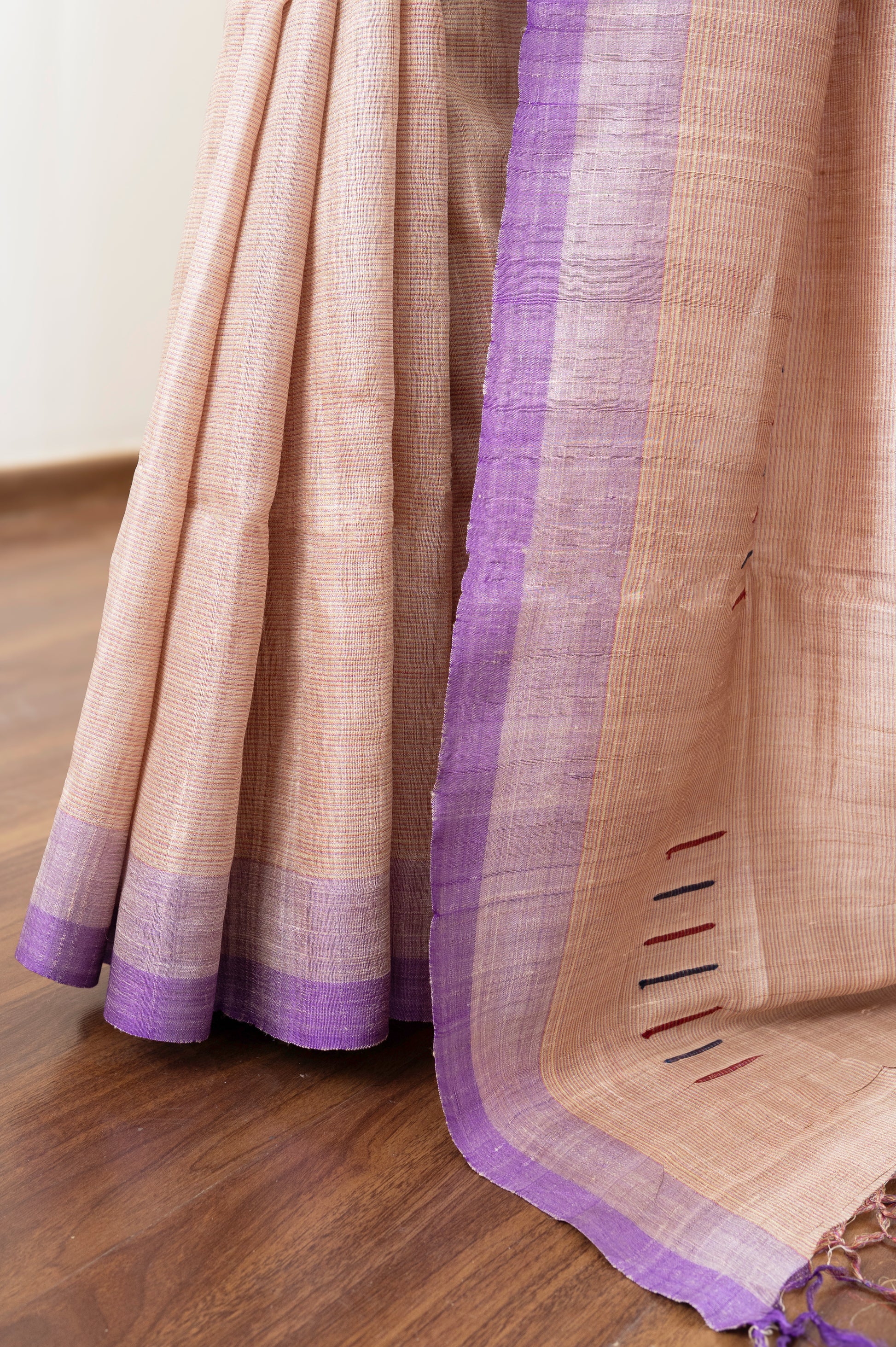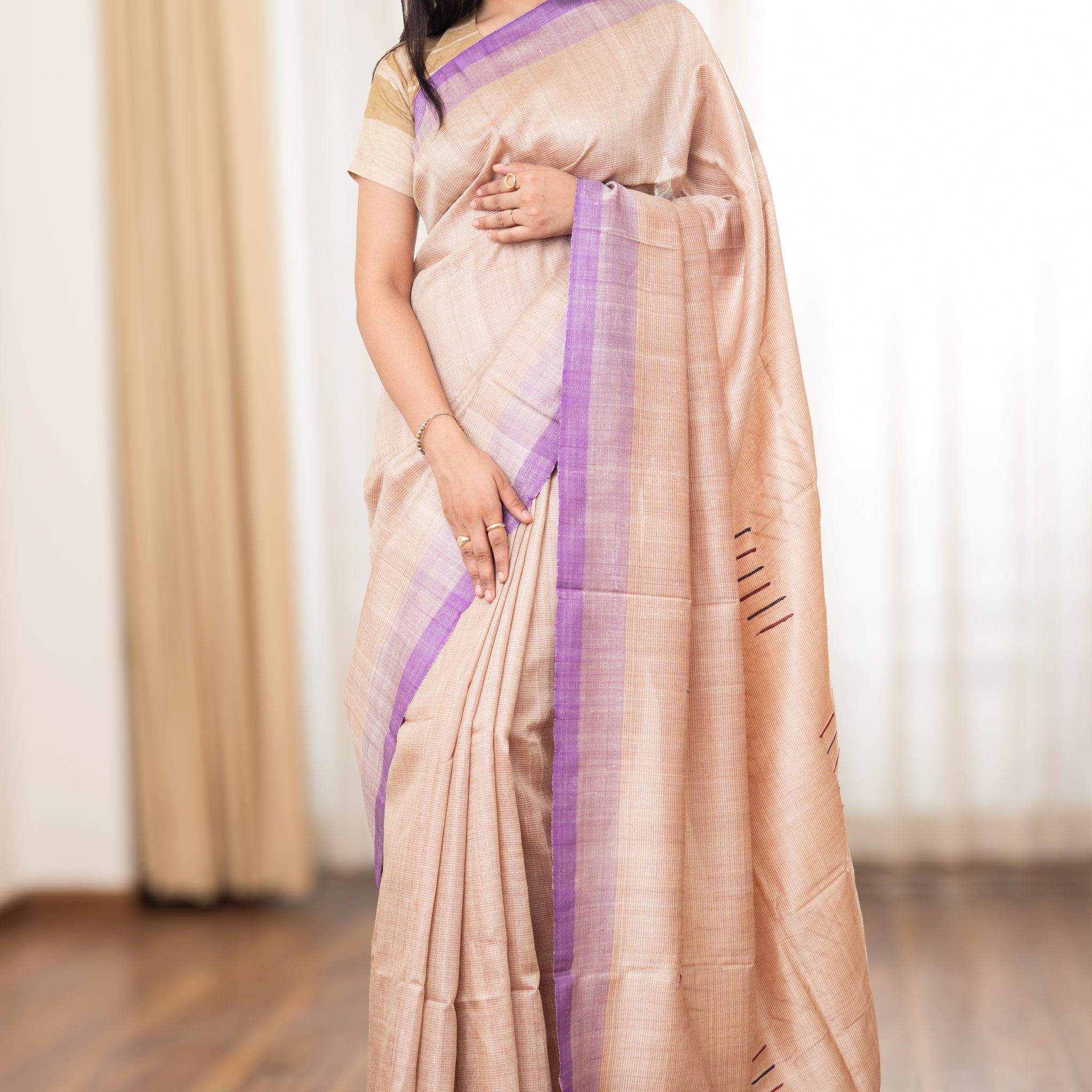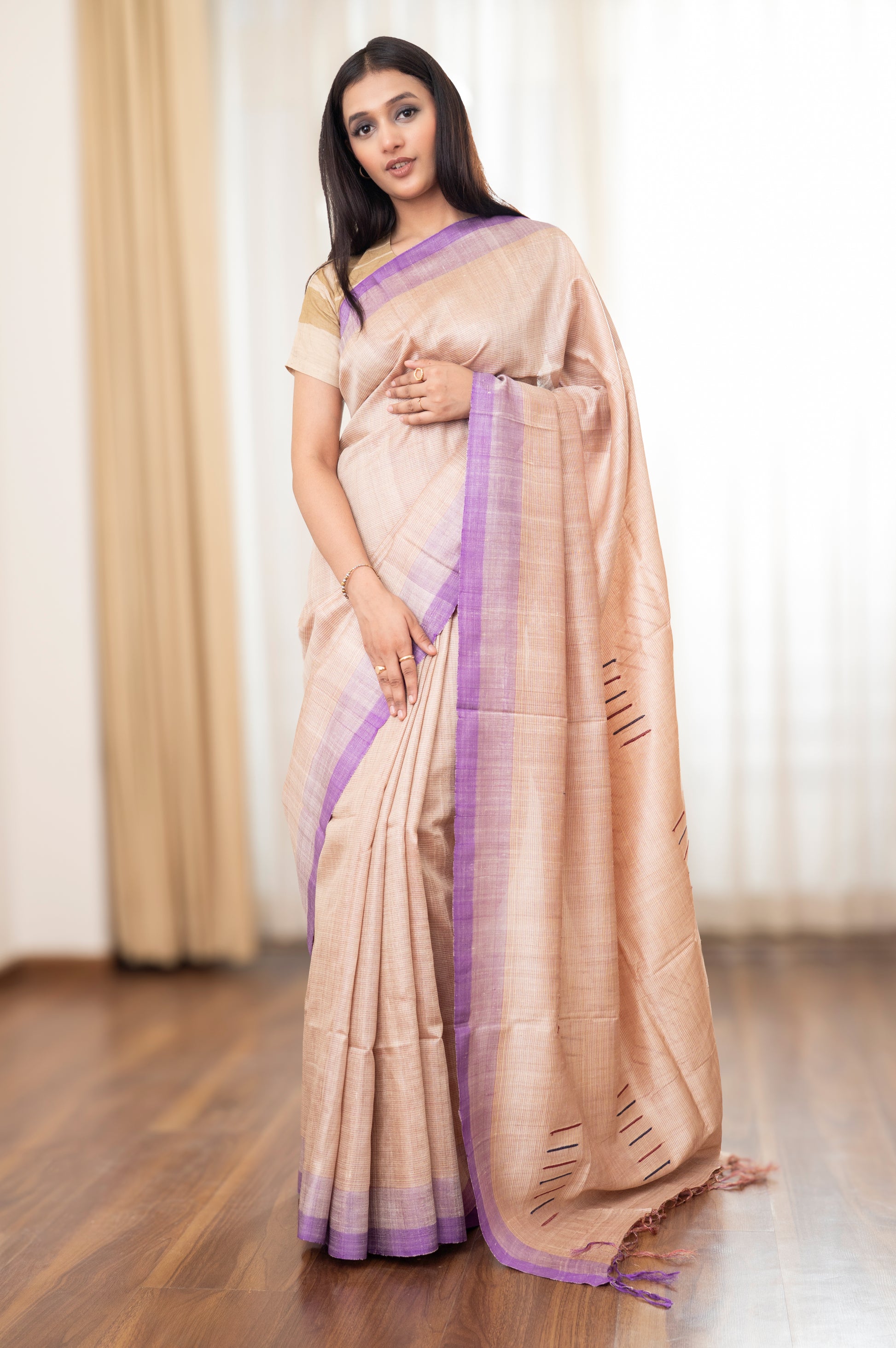 Soft as a sigh and radiant in its simplicity, this blush pink Tussar silk saree is a quiet celebration of craft and color. A delicate lavender border adds refined contrast, while multicolored thread motifs on the pallu bring subtle artistry to each drape. Lightweight with a natural sheen, it moves with ease—perfect for intimate festivities, cultural gatherings, or sunlit ceremonies. An ode to modern femininity rooted in timeless tradition.