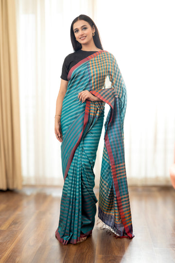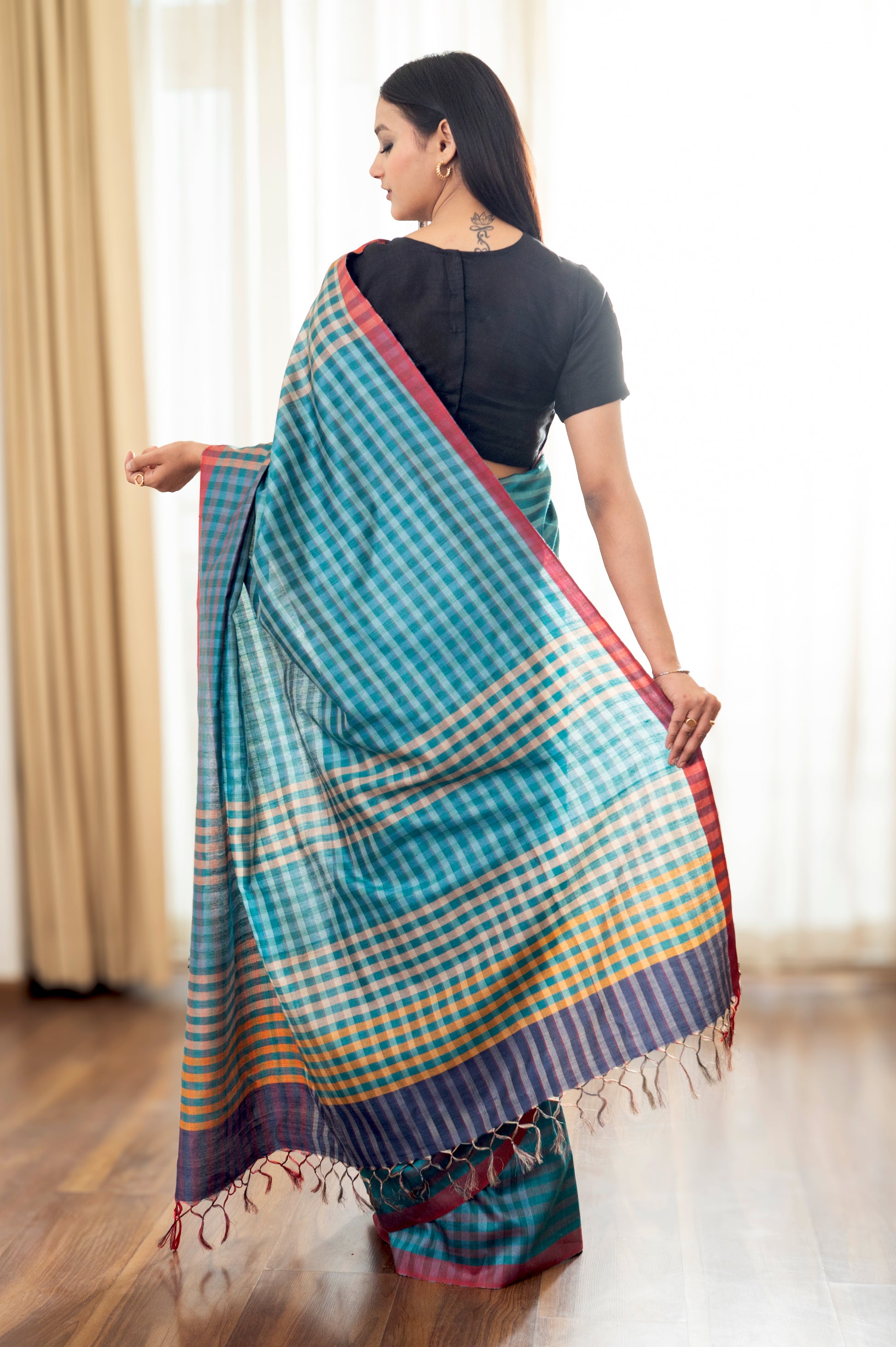 Classic yet current, this black and beige Tussar silk saree tells a story through its bold checked pattern—where heritage weaving meets contemporary sensibility. Crafted in breathable, naturally textured silk, it offers effortless elegance for formal events, cultural moments, or refined everyday wear. Understated yet striking, it’s a wardrobe essential that balances depth, grace, and quiet drama.