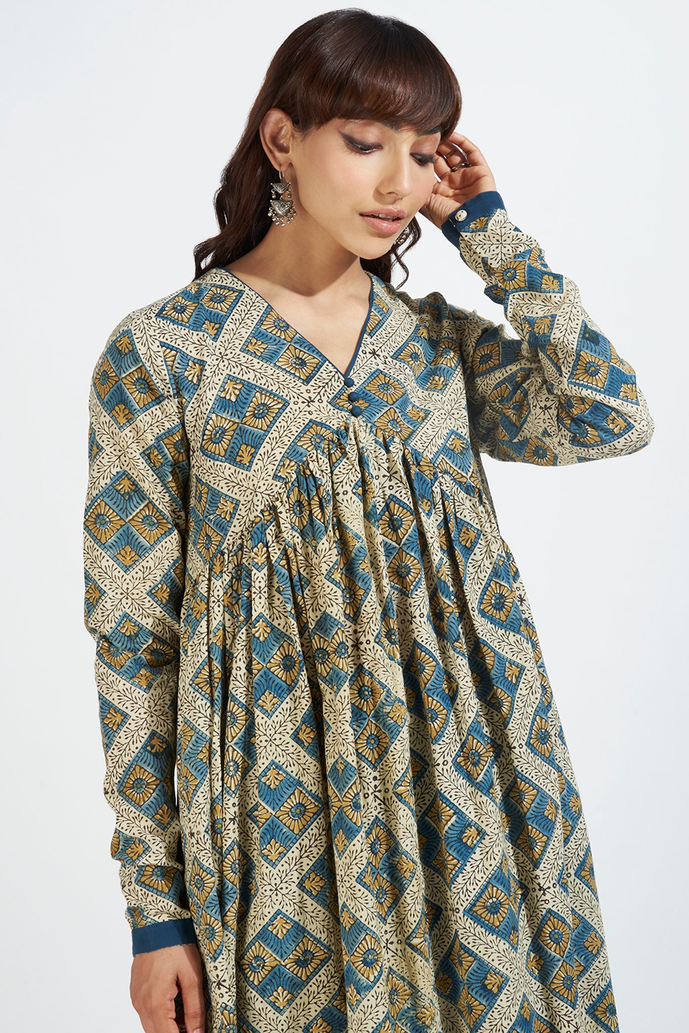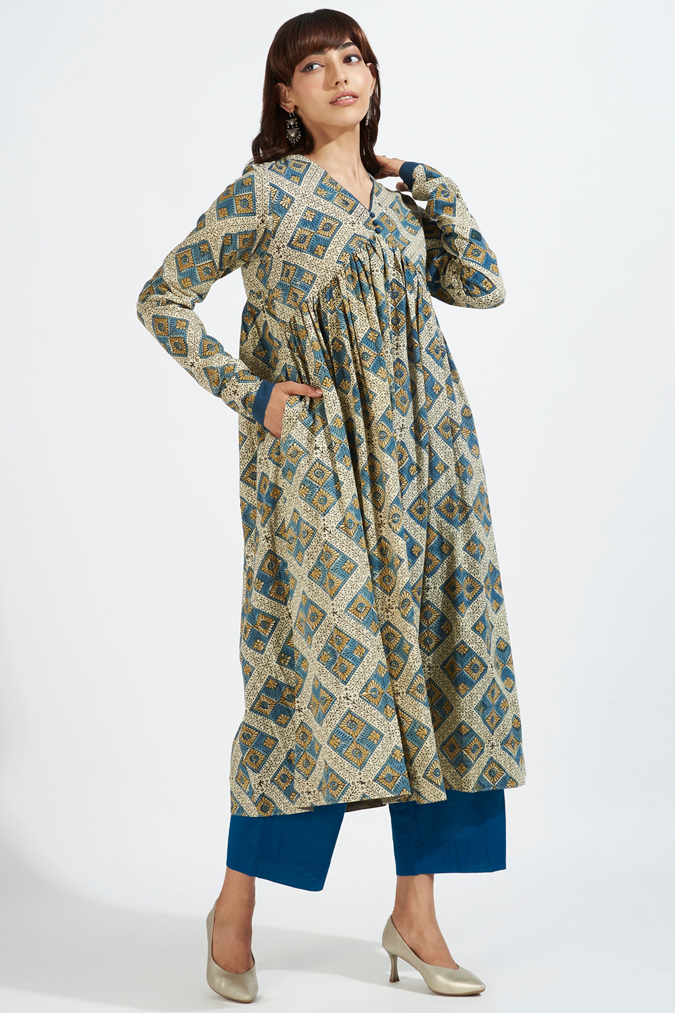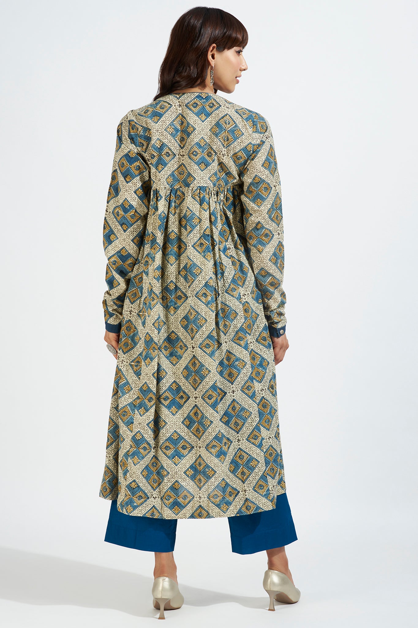Whether you're attending a special occasion or simply want to celebrate India, this anarkali is the perfect choice. Pair it with indigo chudidar or pants, complemented by silver jewelry and pumps, for a classic and captivating look. Experience the fusion of traditional and contemporary charm with our exquisite ajrakh anarkali design.