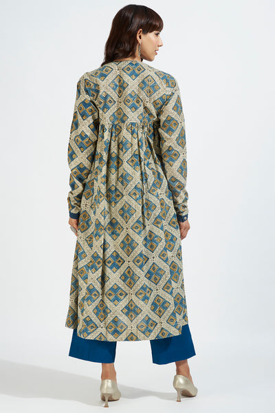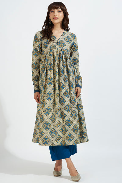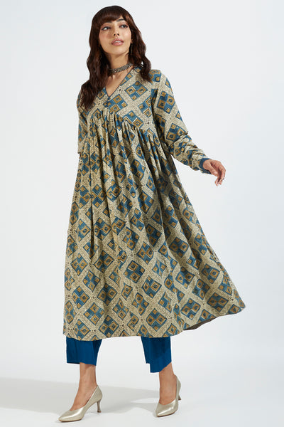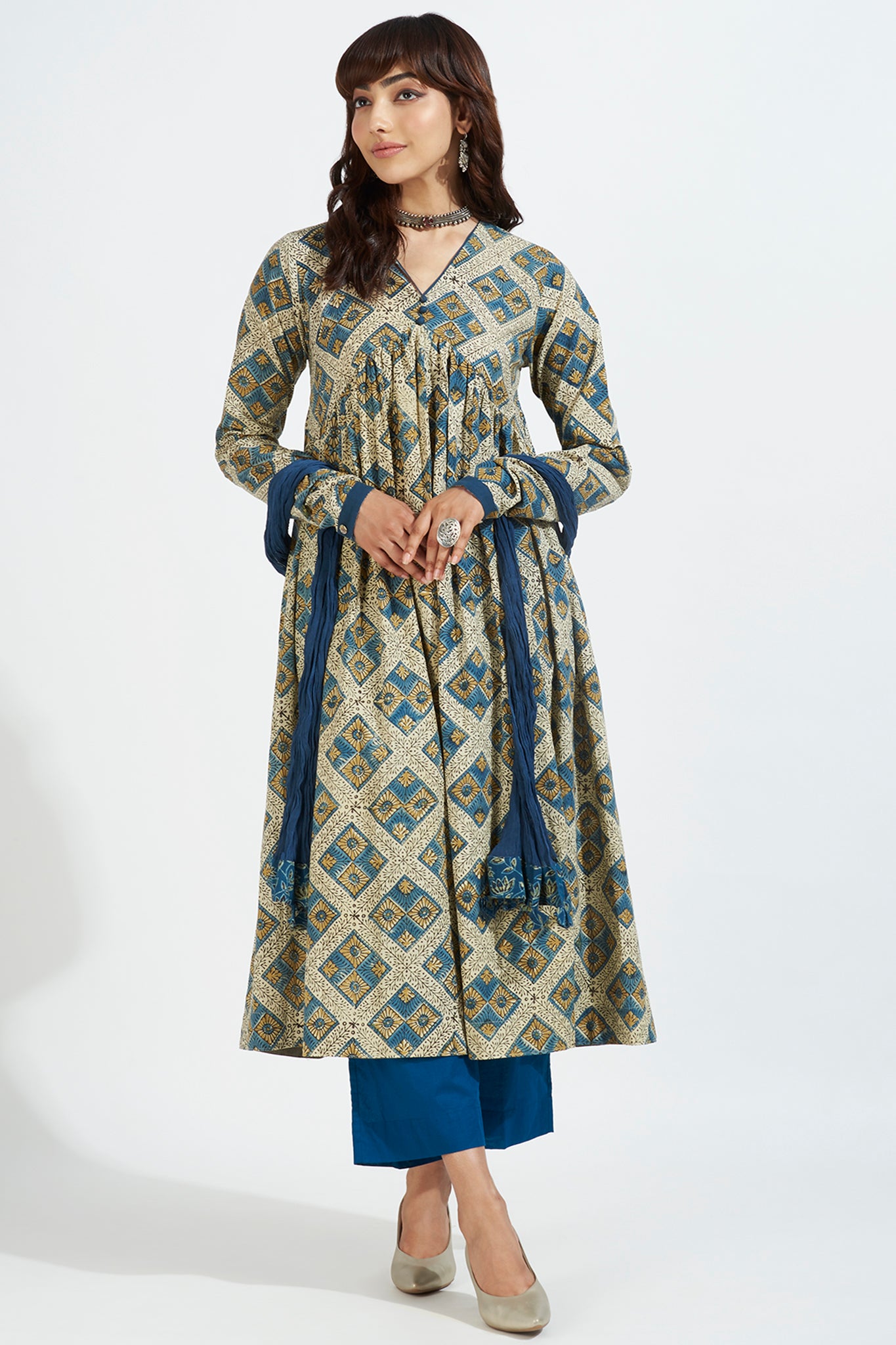 Handblock printed with natural dyes using the intricate ajrakh technique, this anarkali features a captivating geometrical motif print that exudes an old-world charm. The chudidar sleeves, gathers on the bust, and flattering regal fit add an air of grace and elegance to your attire.